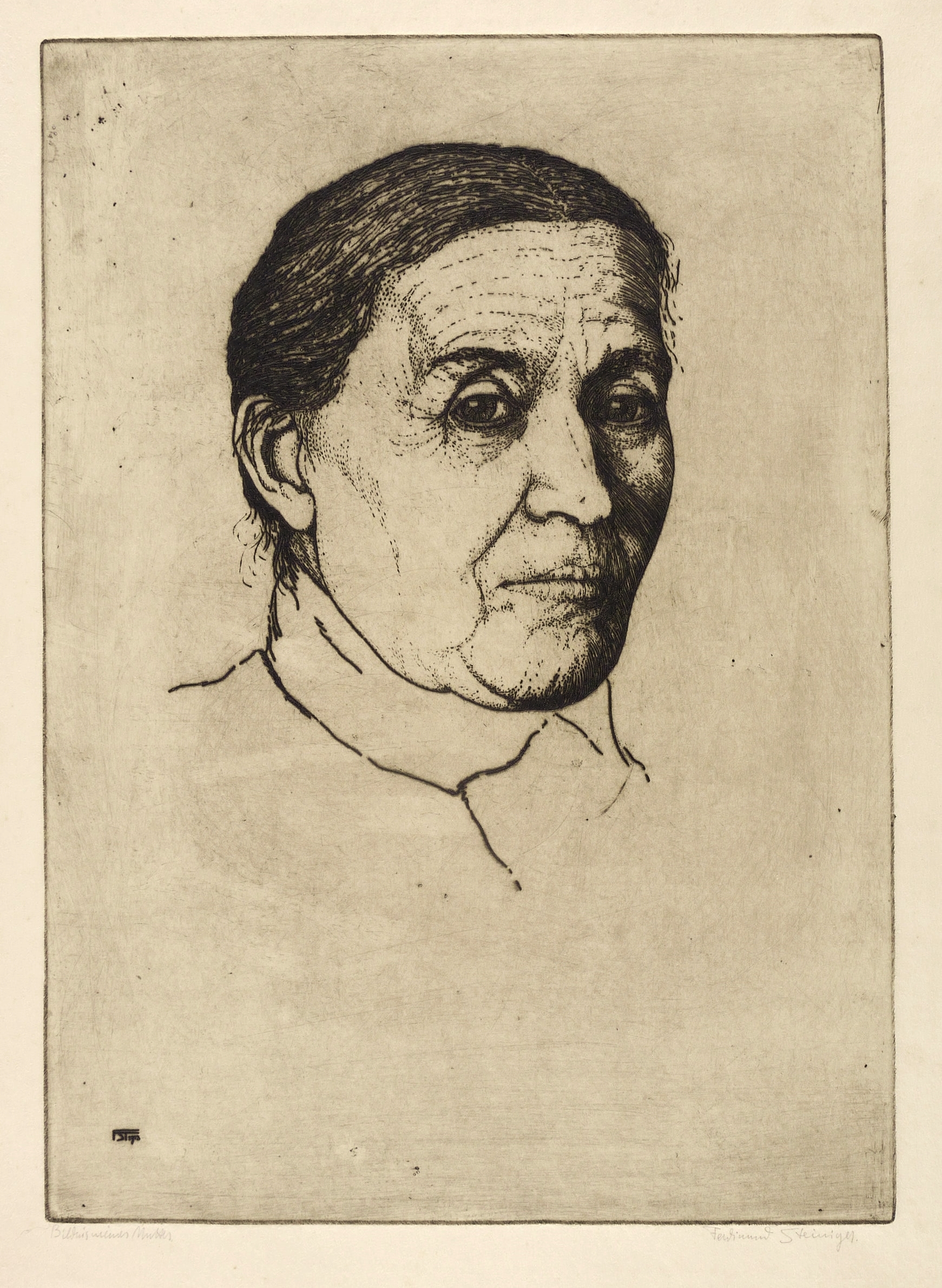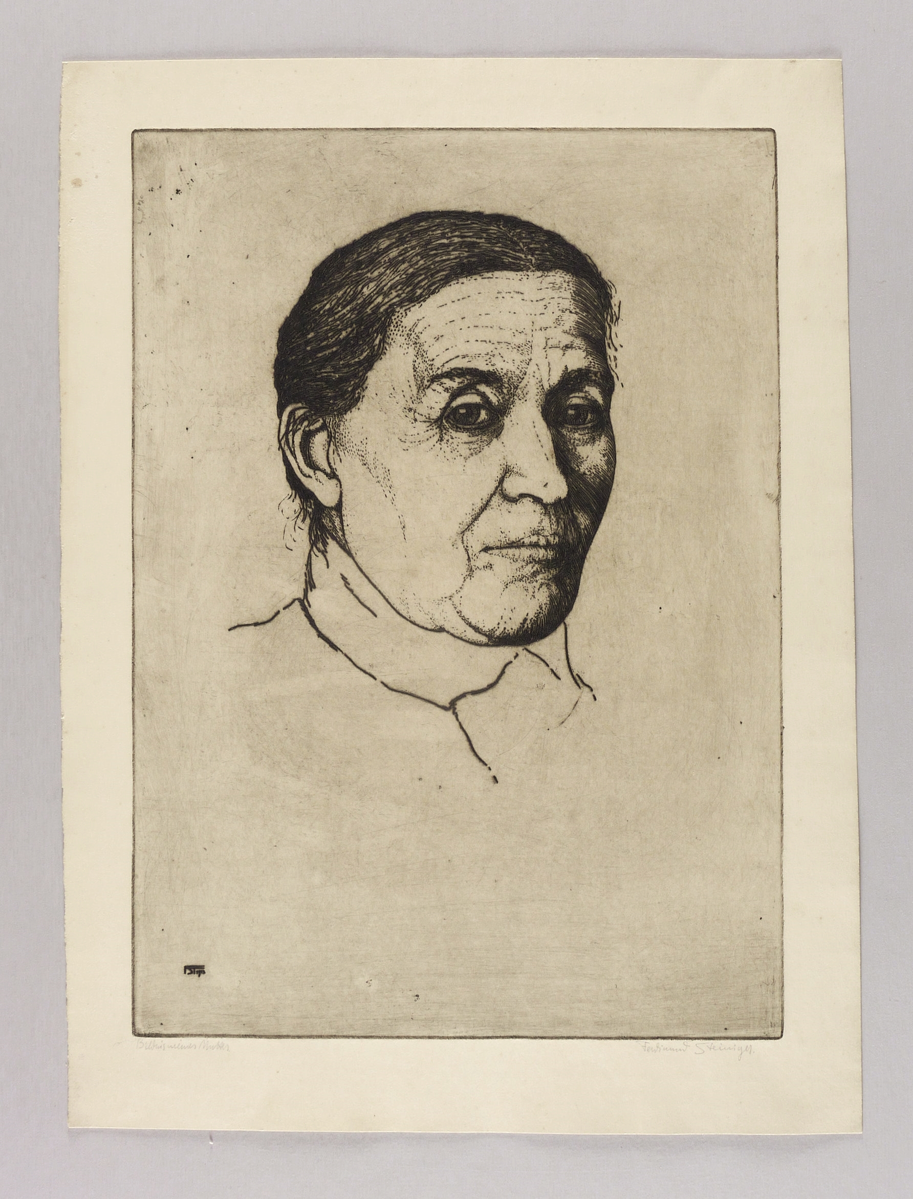 Rechts unten in Bleistift signiert: ″Ferdinand Steiniger.″ Links Titel: ″Bildnis meiner Mutter.″ In der Platte links unten Monogramm und Jahr: ″FST 1912″. – Papier mit Altersspuren. Sonst guter Zustand.