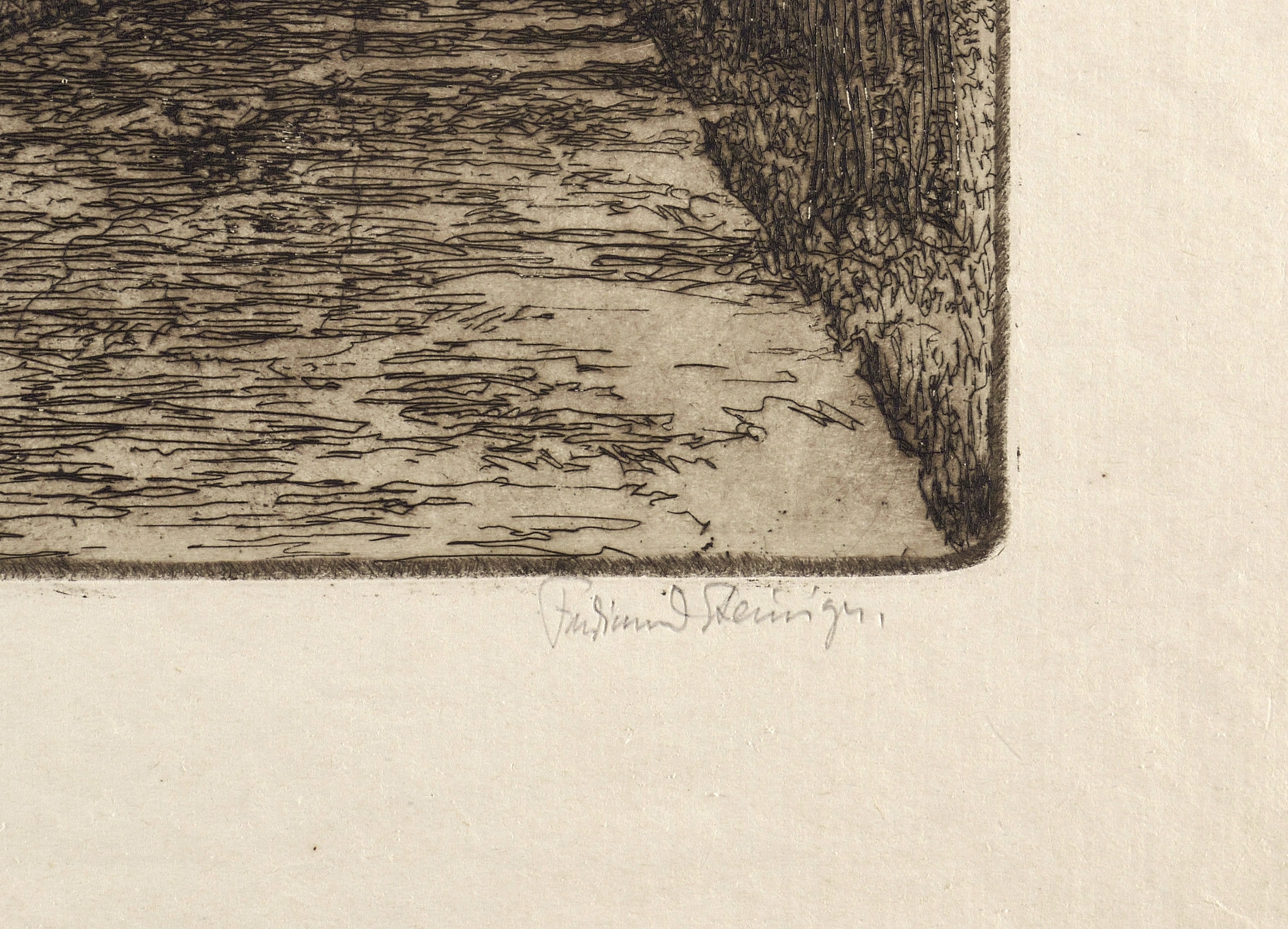 1921. Radierung / Strichätzung, mit Plattenton, in Schwarzbraun, auf gelbem Bütten. – Originale Künstlergrafik, von Ferdinand Steiniger. – 29,5 x 39,5 cm (Darstellung / Platte), 38 x 47 cm (Blatt).