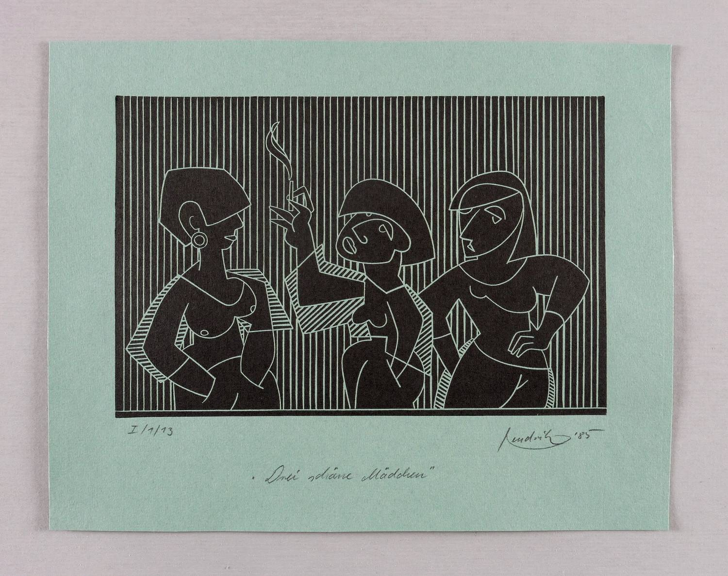 Rechts unten in Bleistift signiert und datiert: ″hendrik 85″. Links Auflagenbezeichnung: ″I/1/13″. Mittig Titel: ″Drei schöne Mädchen″. – Sehr guter Zustand.