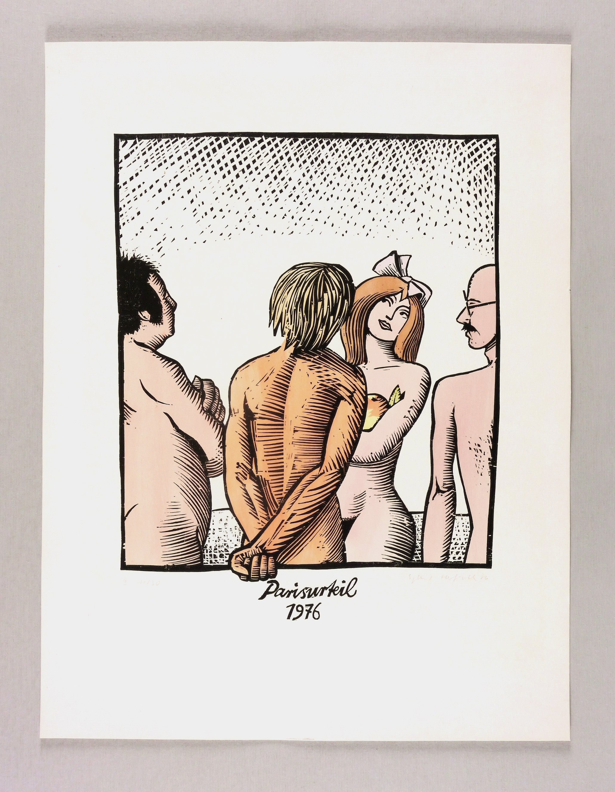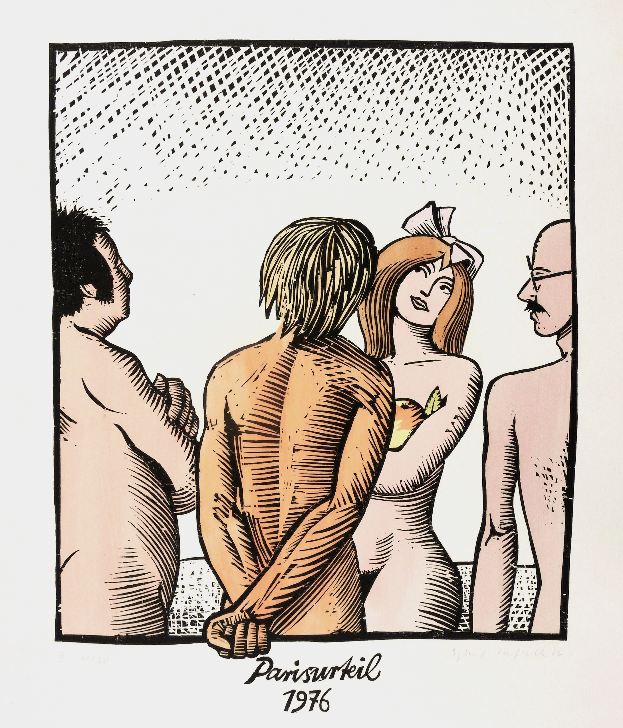 Rechts unten in Bleistift signiert und datiert: ″Egbert Herfurth 76″. Links eigenhändige Auflagenbezeichnung: ″III 11/30″. – Hauptblatt des Künstlers. - Herfurth kehrt das mytologische Motiv augenzwinkernd um und lässt eine Frau, hier Eva mit dem Apfel als Paradies-Anspielung, zwischen drei Männern wählen. – Breitrandiges Exemplar. Sehr guter Zustand.