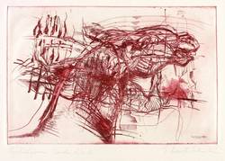 1975. Radierung / Strichätzung & Roulette, in Weinrot, mit leichtem Plattenton, auf hellchamois Weißenborn. – Originale Künstlergrafik, von Dagmar Ranft-Schinke. – Vorzugsdruck. – 19,6 x 29,9 cm (Darstellung / Platte), 38 x 51 cm (Blatt).