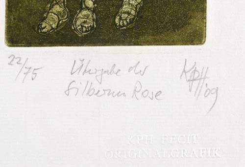 Rechts unten in Bleistift signiert und datiert: ″KPH 09″. Links Auflagenbezeichnung: ″22/75″. Mittig bezeichnet: ″Übergabe der silbernen Rose″. Blindstempel des Künstlers. – Sehr guter Zustand.