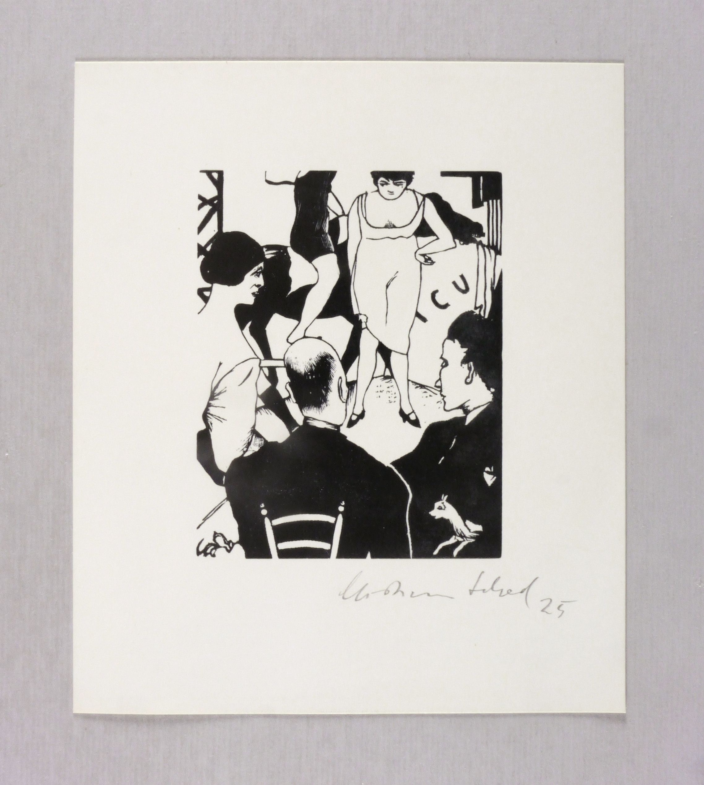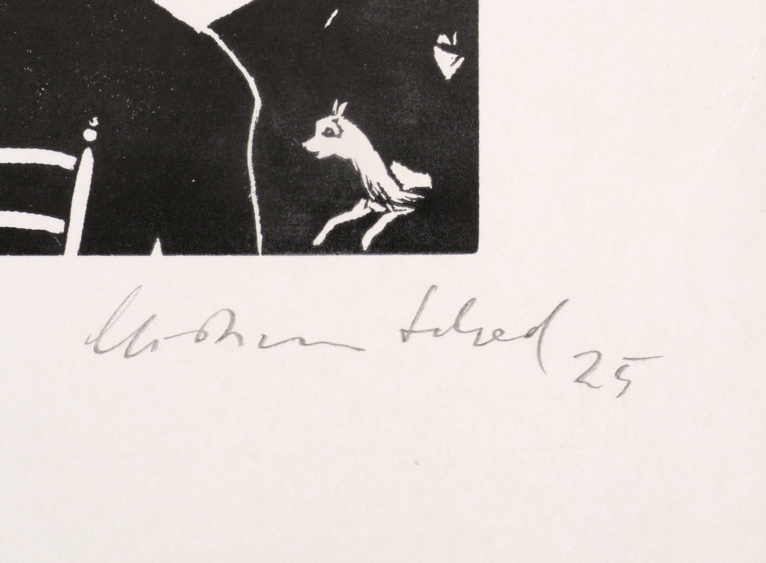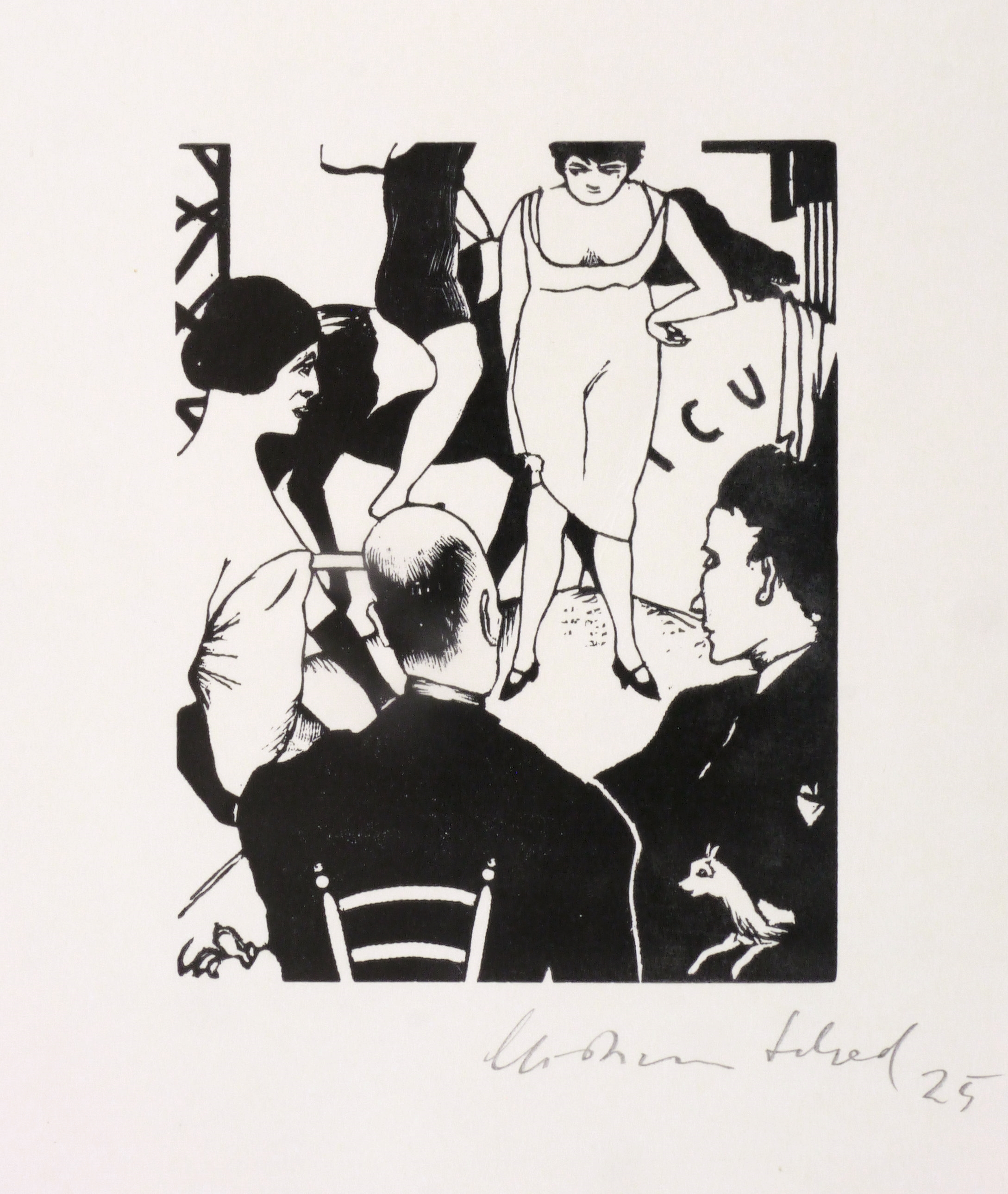 1925. Holzschnitt, in Schwarz, auf glattem weißem Karton. – Originale Künstlergrafik, von Christian Schad. – 12,2 x 9,6 cm (Darstellung / Druckbild), 21 x 18 cm (Blatt).