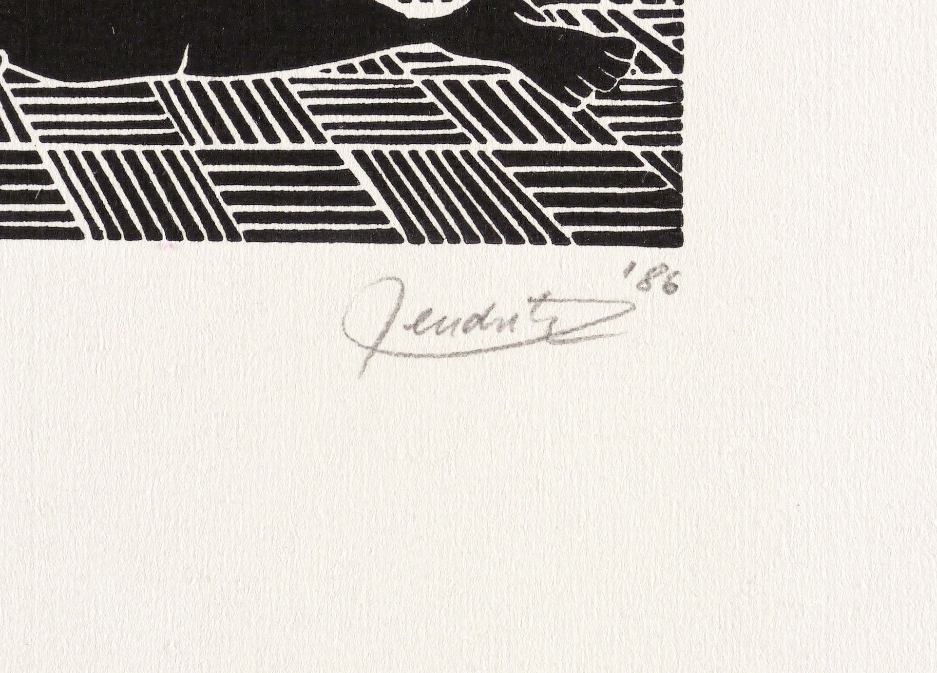1986. Linolschnitt, in Schwarz, auf rauem hellchamois Bütten. – Originale Künstlergrafik, von Hendrik Hause. – Auflage Exemplar Nr. 1/10. – 12,5 x 17,6 cm (Darstellung / Druckbild), 35 x 27 cm (Blatt).