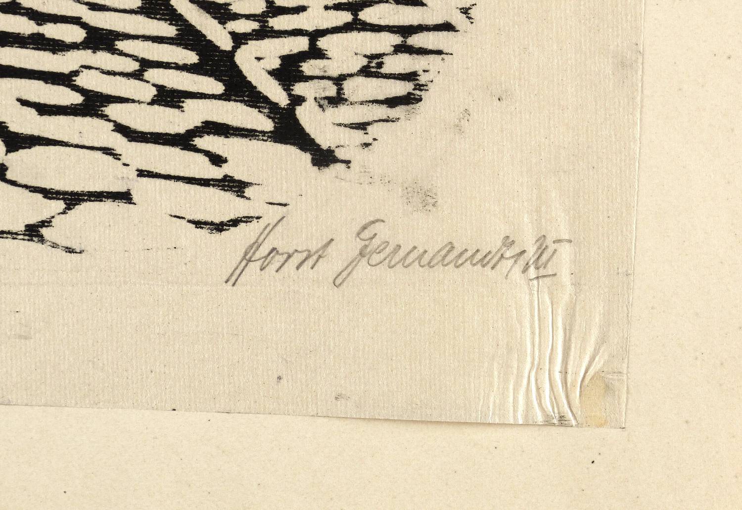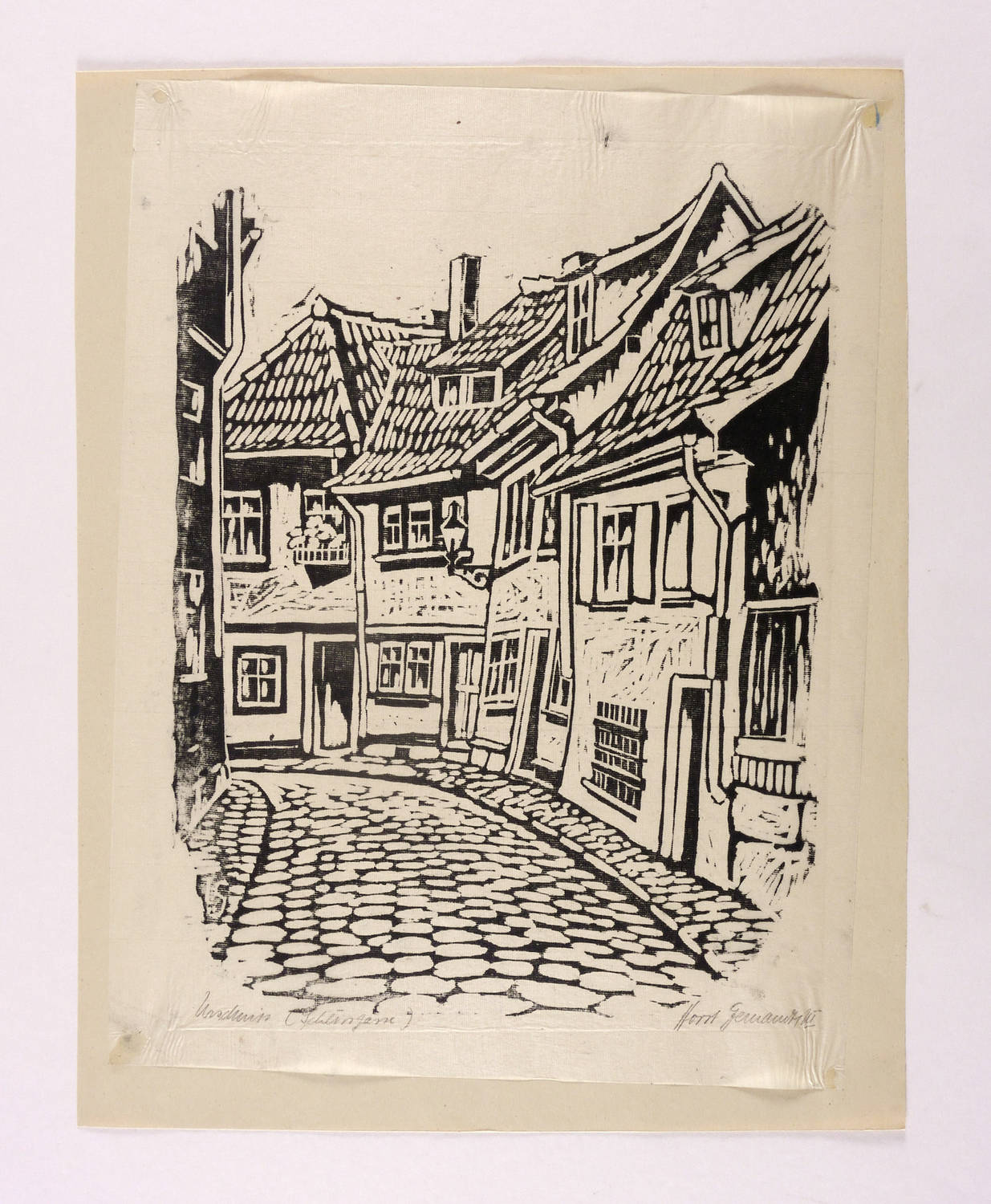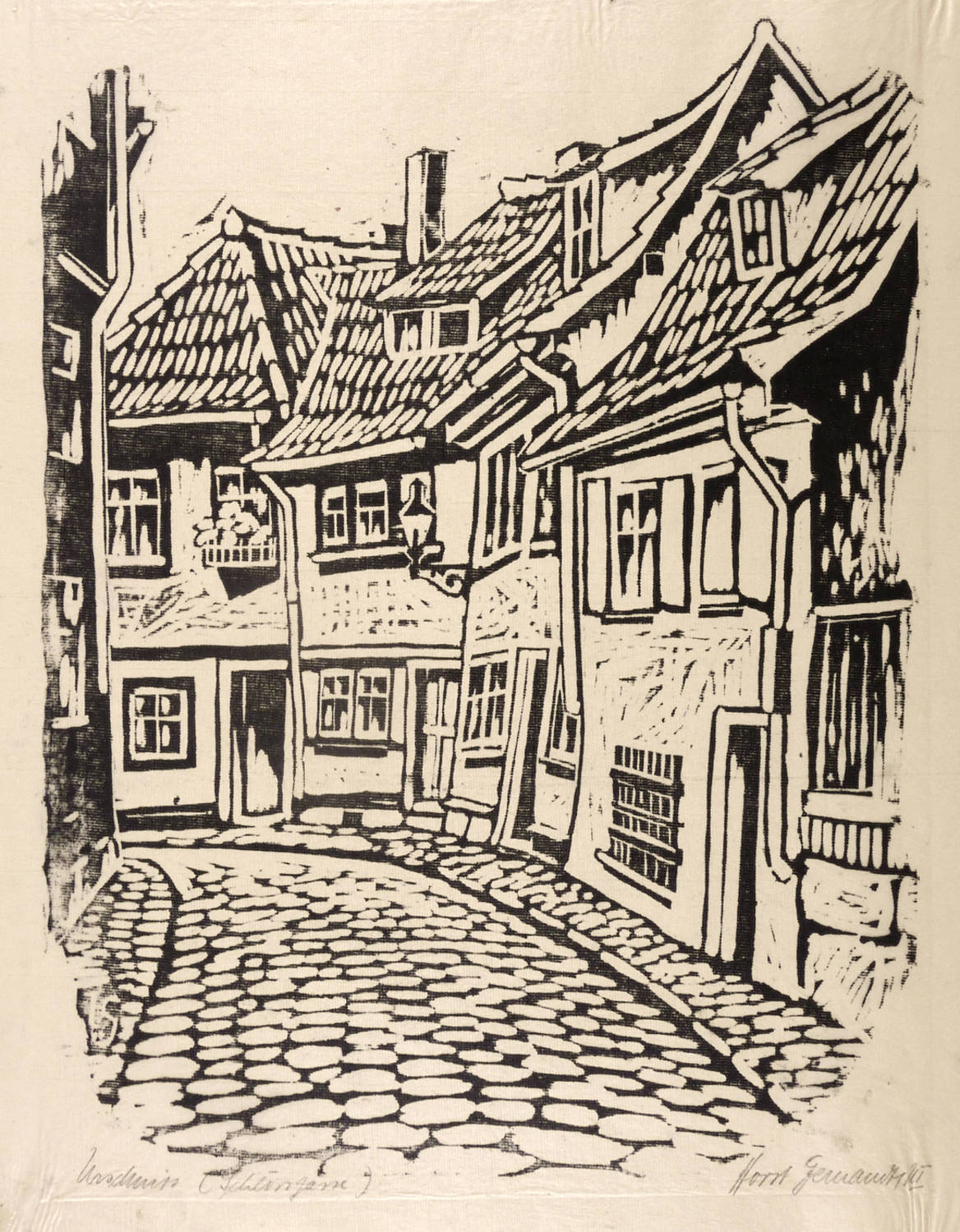 Rechts unten in Bleistift signiert: ″Horst Gernandt″. Links bezeichnet: ″Urschnitt (Schlossgasse)″. – Das Japanpapier original in den Ecken auf Trägerpapier gesetzt. Guter Zustand.