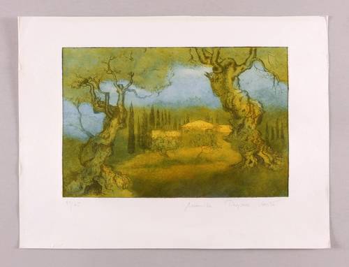 Um 1980. Farbradierung / Aquatinta, in 4 Farben, auf hellchamois Velin. – Originale Künstlergrafik, von Monika Propach-Voeste. – Auflage Exemplar Nr. 35/75. – 19,8 x 29,7 cm (Darstellung / Platte), 31 x 41 cm (Blatt).