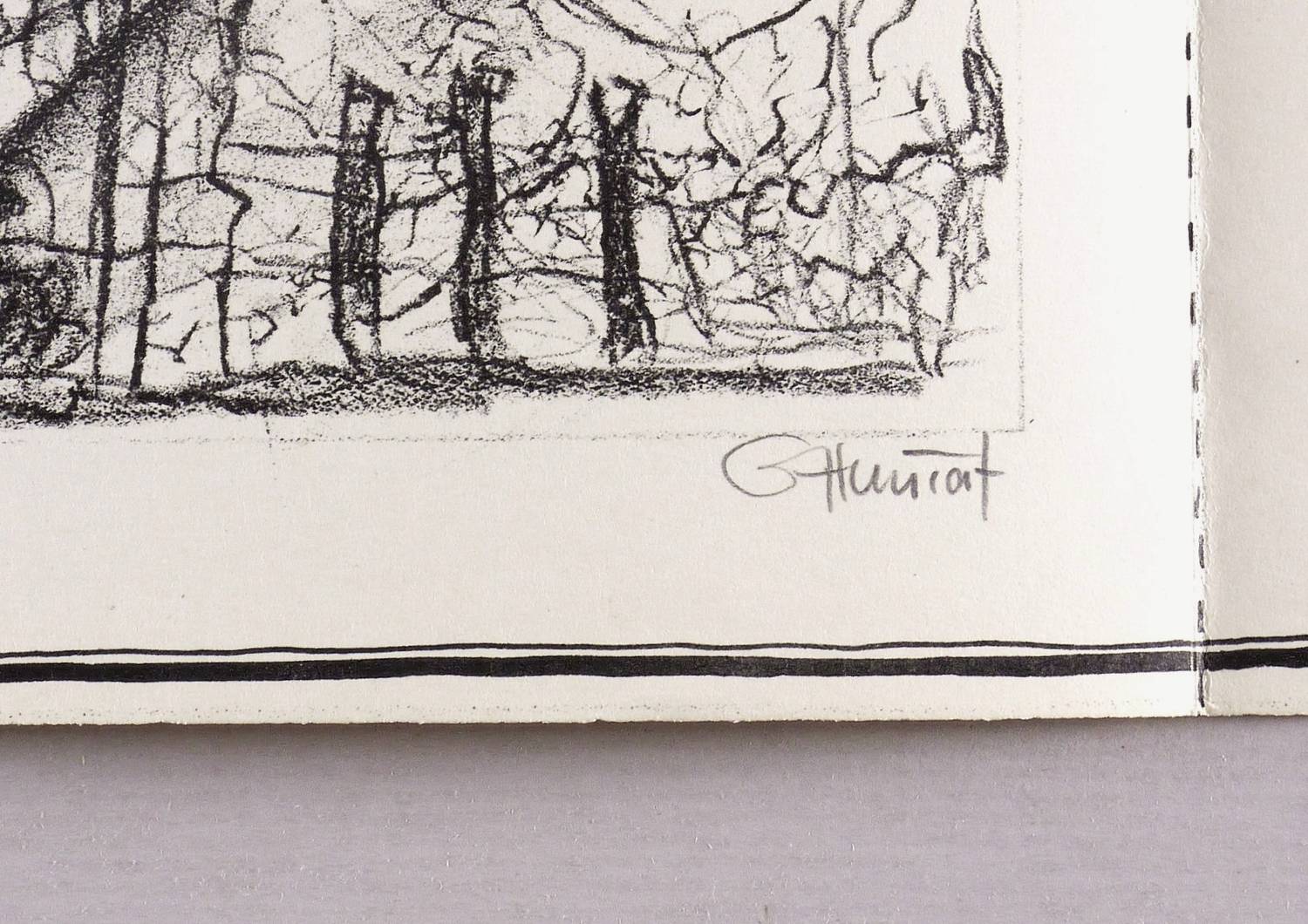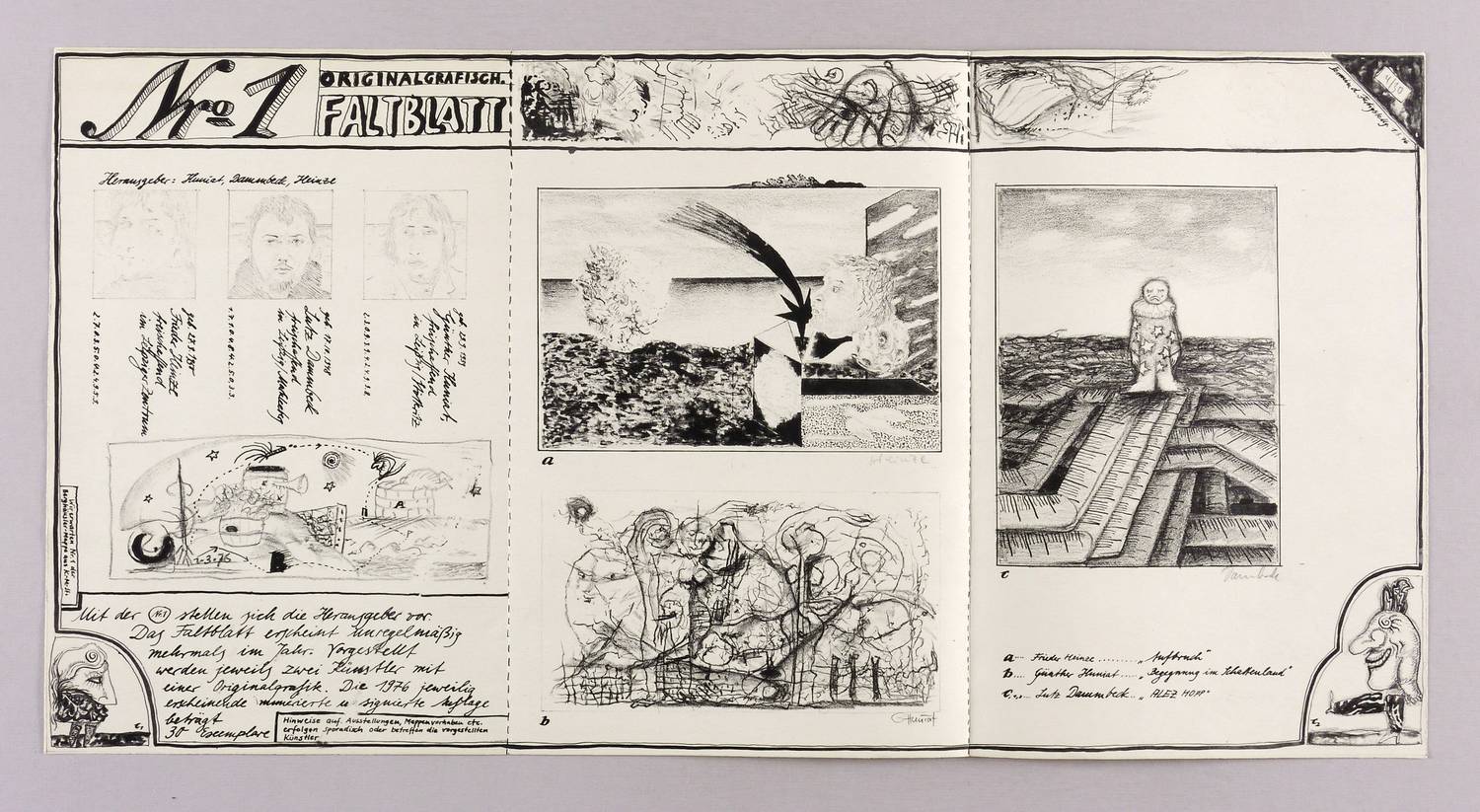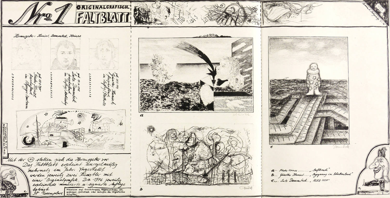 Aus: Originalgrafisches Faltblatt (Leipzig: Günther Huniat, Lutz Dammbeck, Frieder Heinze 1976), Bd. 1. – Die drei Grafiken jeweils rechts unten in Bleistift signiert: ″Heinze // G. Huniat // Dammbeck″. In der Ecke rechts oben Auflagenbezeichnung: ″4/30″. – Einseitig bedrucktes ″Originalgrafisches Faltblatt″ Nr. 1, herausgegeben von Günther Huniat, Lutz Dammbeck und Frieder Heinze, enthaltend je 1 Lithografie von Frieder Heinze (″Aufbruch″), Günther Huniat (″Begegnung im Schattenland″) und Lutz Dambeck (″ALEZ HOPP″). Dazu Textblatt mit Erläuterung zum editorischen Vorhaben sowie 3 Porträts der beteiligten Künstler. – Selten. – Tadellos. Sehr guter Zustand.