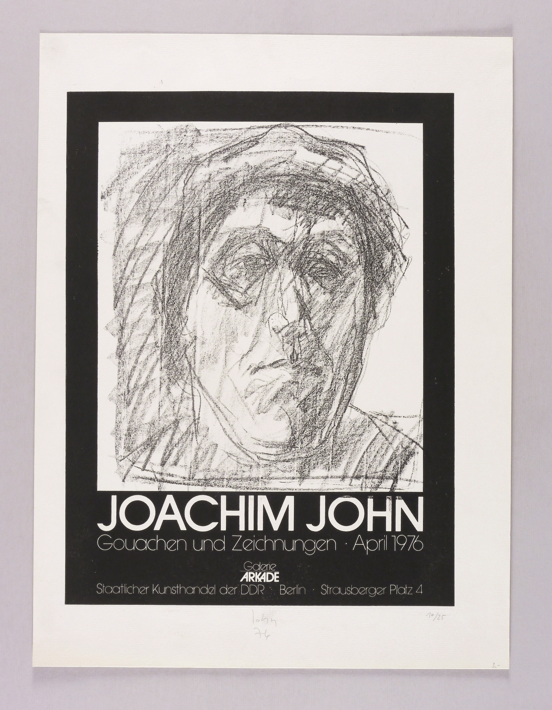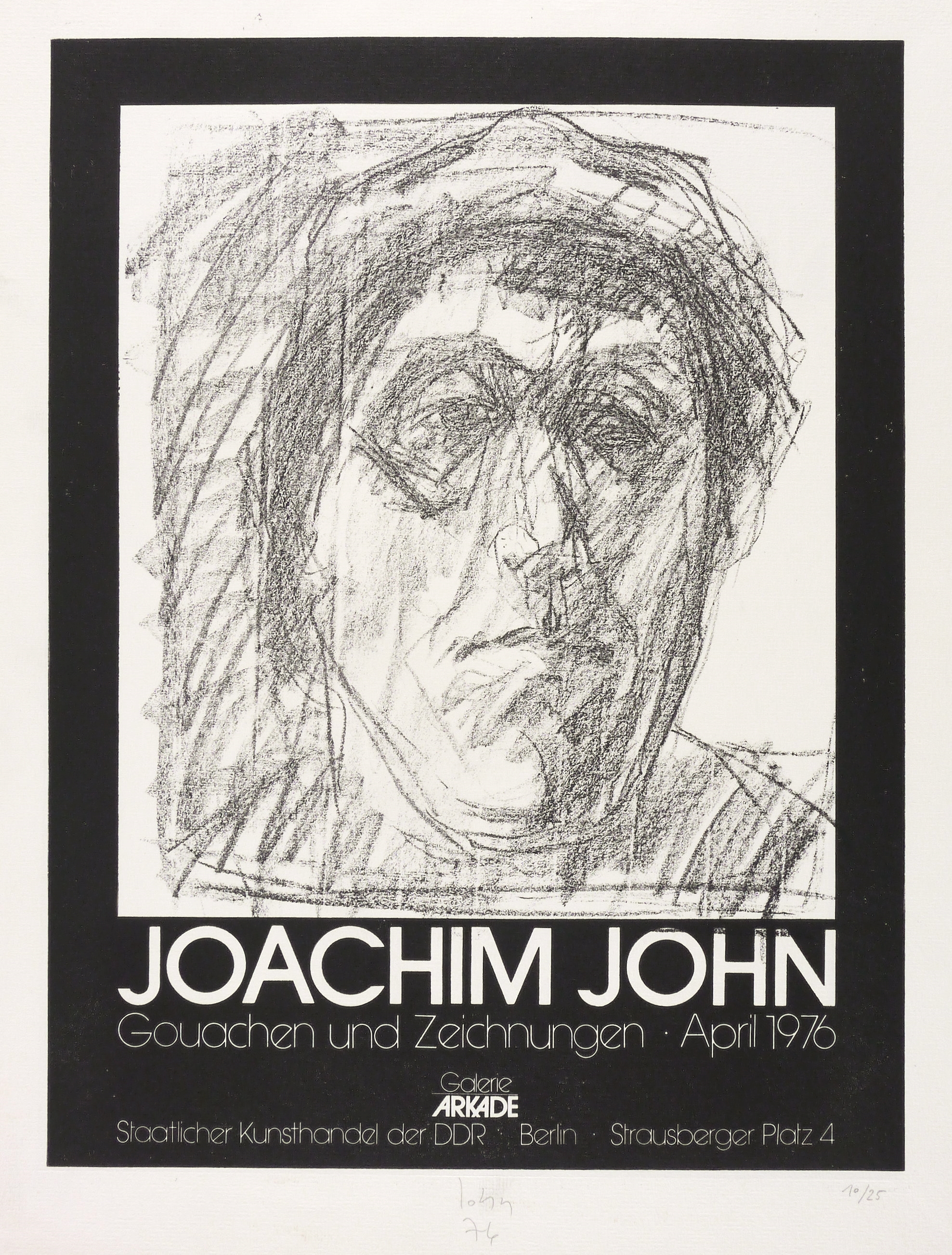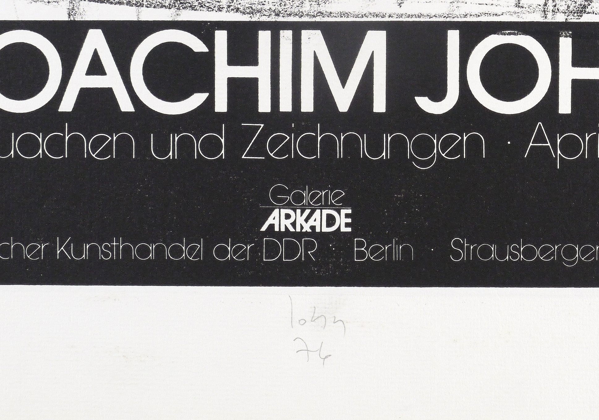 Unterhalb in Bleistift signiert und datiert: ″John 74″. Rechts Auflagenbezeichnung: ″10/25″. – Originalgrafisches Künstlerplakat zur Ausstellung ″Joachim John. Gouachen und Zeichnungen″ in der Galerie Arkade Berlin im April 1974. – Sehr guter Zustand.