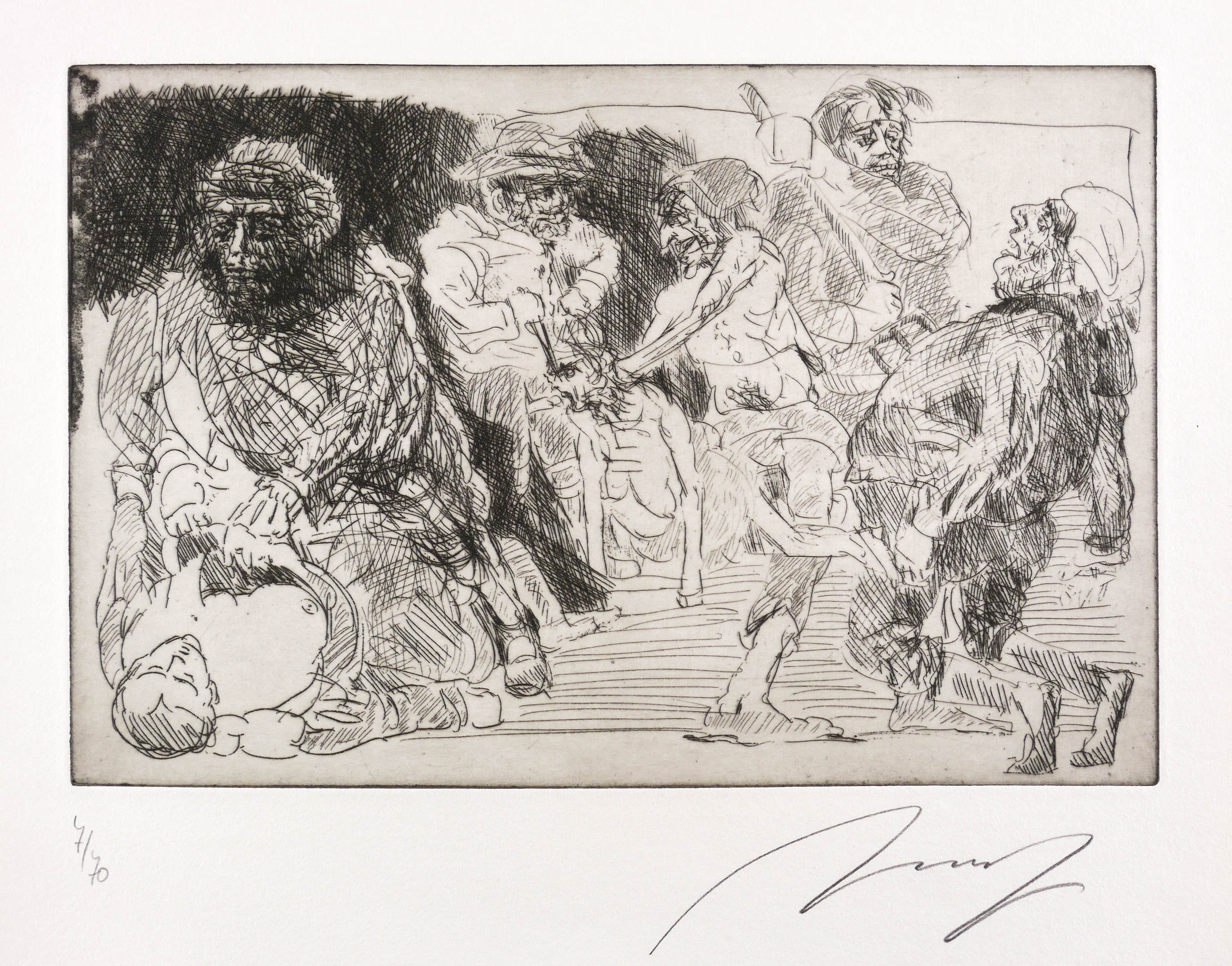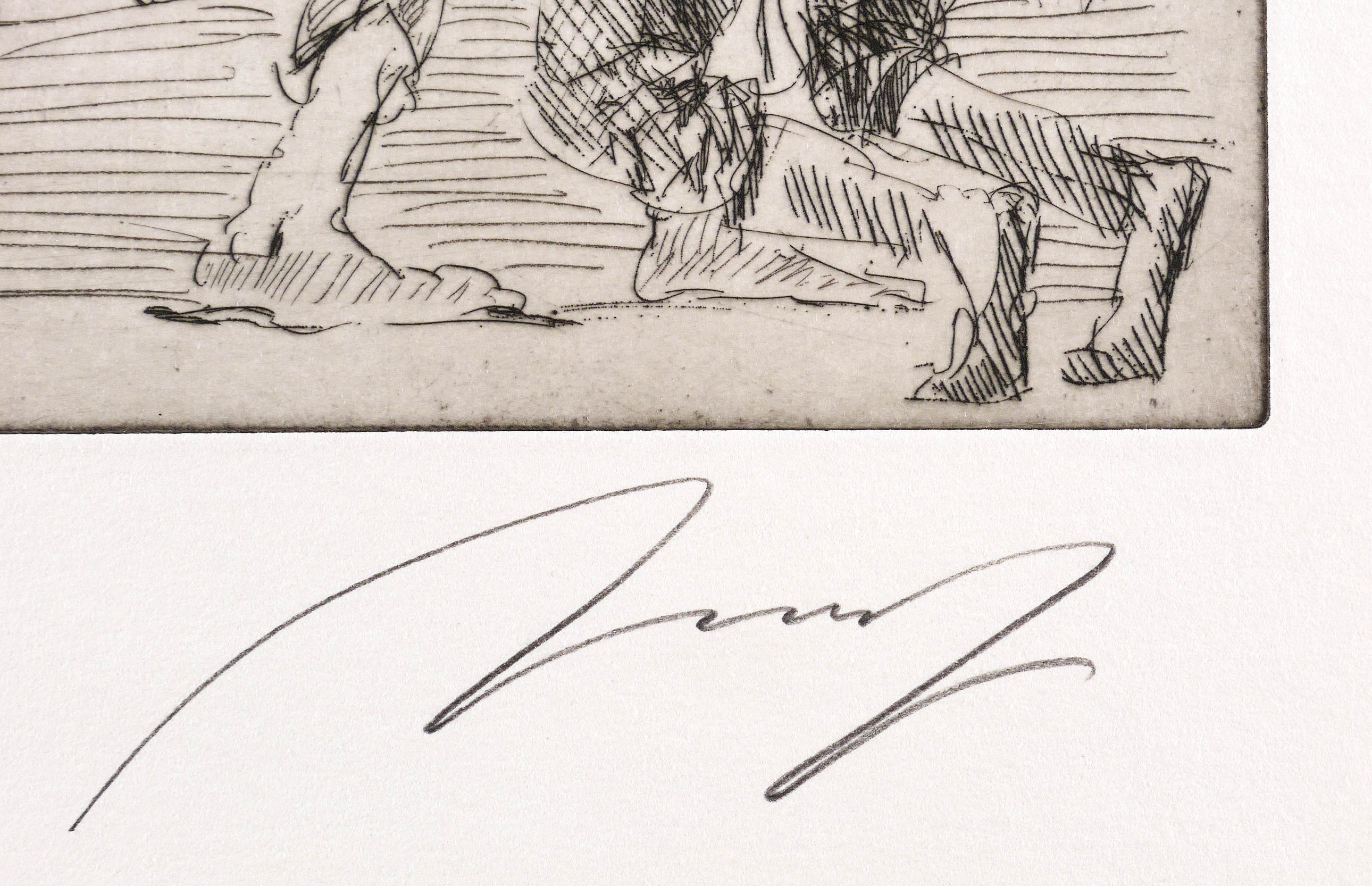 1987. Radierung / Strichätzung, in Schwarz, mit Plattenton, auf chamois Velinkarton. – Originale Künstlergrafik, von Alfred Hrdlicka. – Auflage Exemplar Nr. 7/70. – 20,0 x 30,0 cm (Darstellung / Platte), 32 x 37 cm (Blatt).