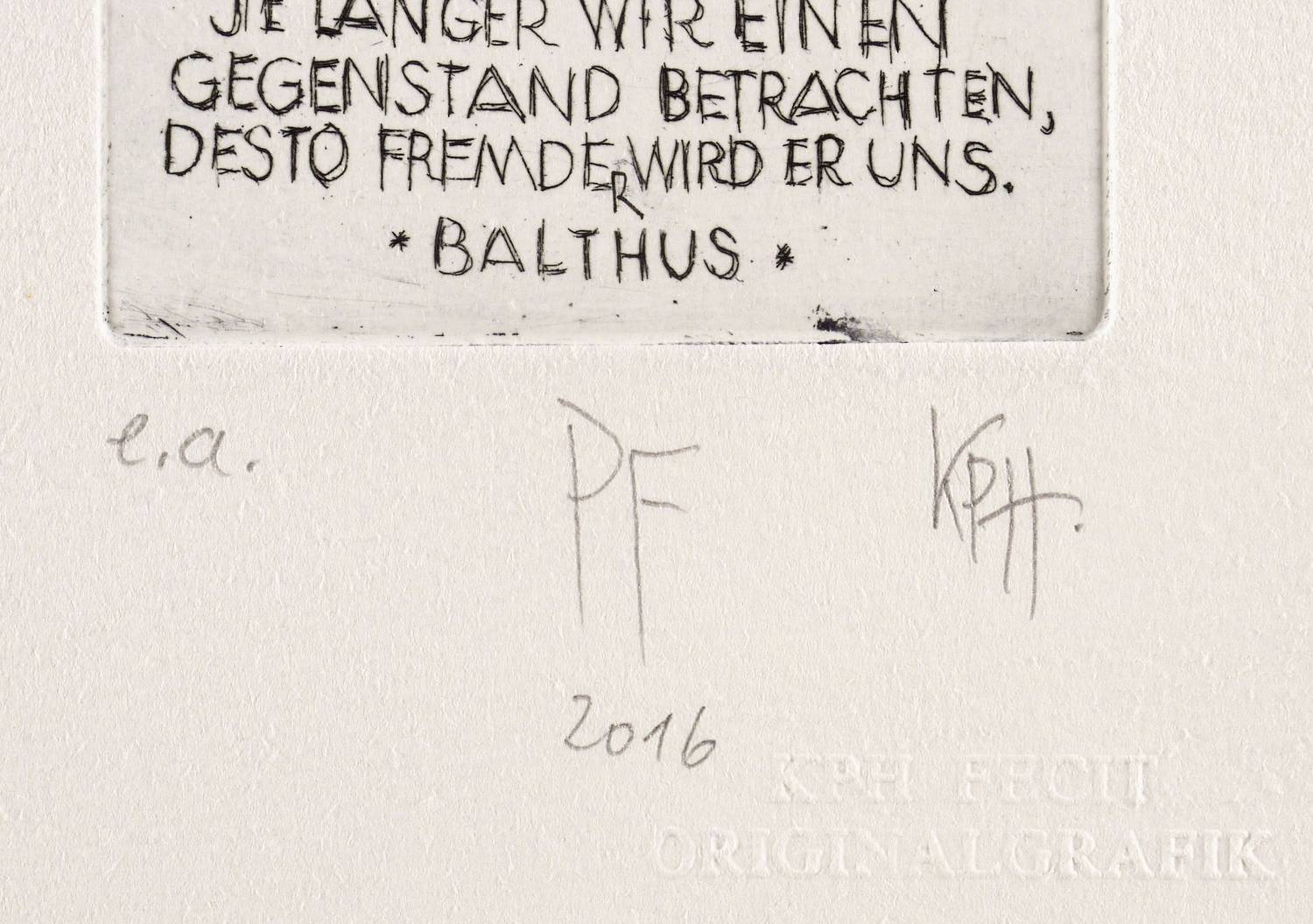 Rechts unten in Bleistift signiert: ″KPH″. Links Auflagenbezeichnung: ″e.a. ″ Mittig bezeichnet: ″PF 2016″. Blindstempel des Künstlers. – Sehr guter Zustand.