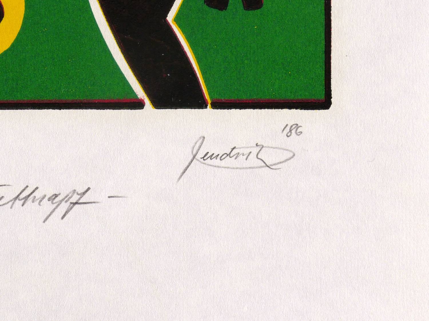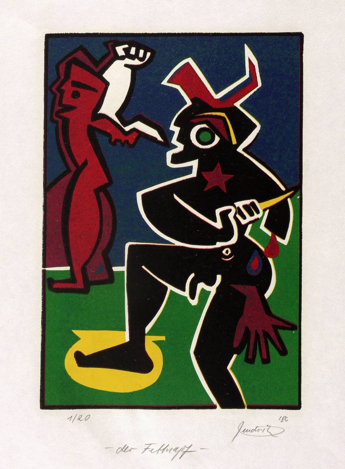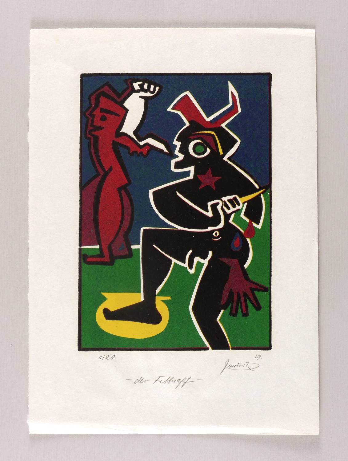 Rechts unten in Bleistift signiert und datiert: ″hendrik 86″. Links Auflagenbezeichnung: ″1/20″. Darunter Titel: ″der Fettnapf″. – Der untere Blattrand etwas knickspurig. Guter Zustand.