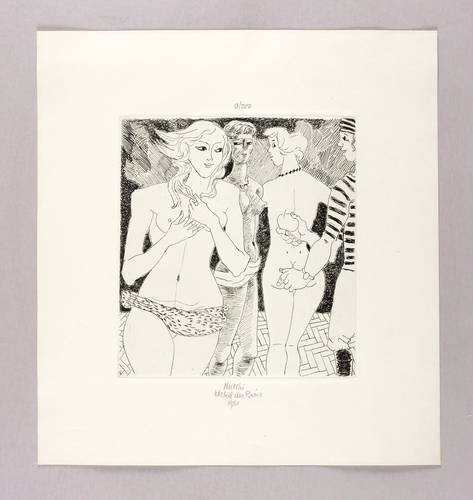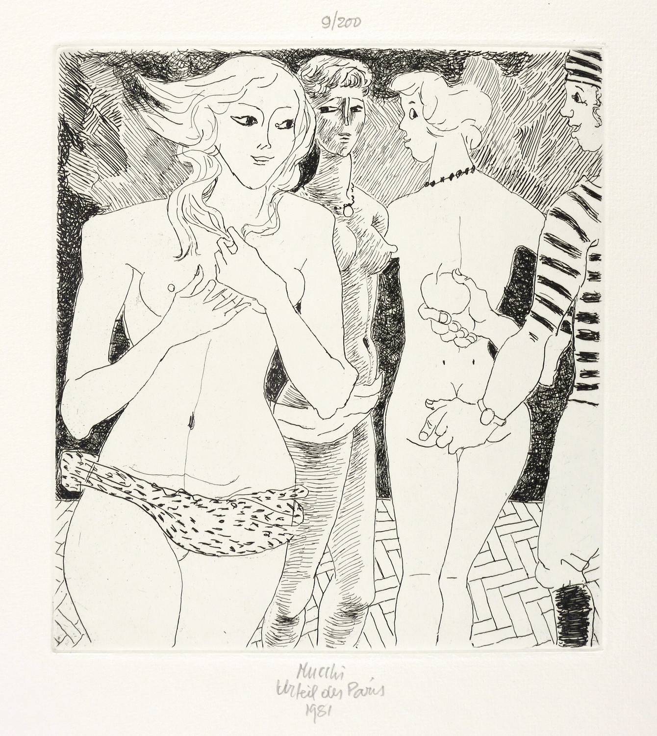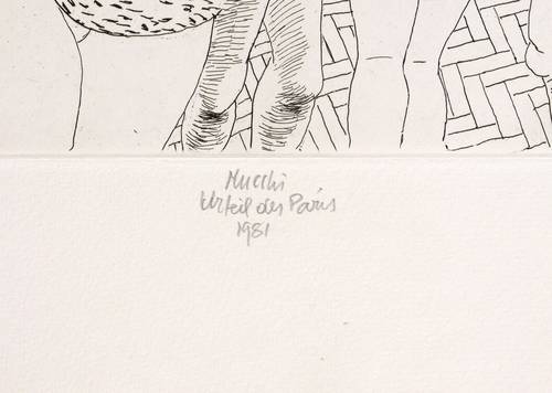 Unterhalb in Bleistift signiert und datiert: ″Mucchi 1981″. Dazu Titel: ″Urteil des Paris″. Oberhalb Auflagenbezeichnung: ″9/200″. – Tadellos. Sehr guter Zustand.