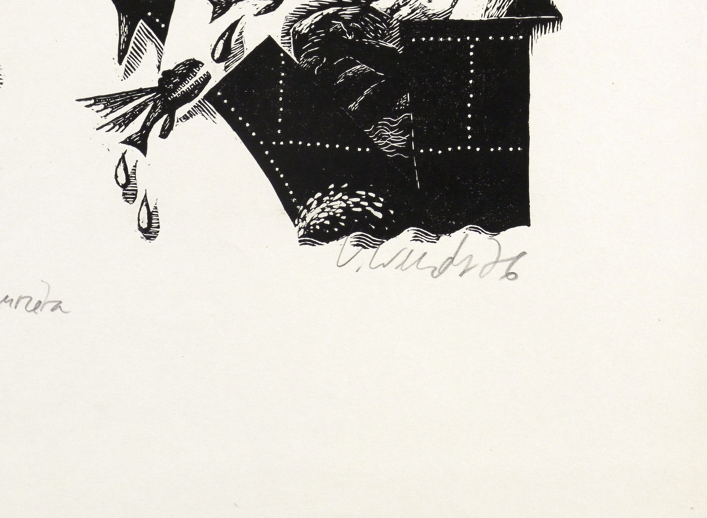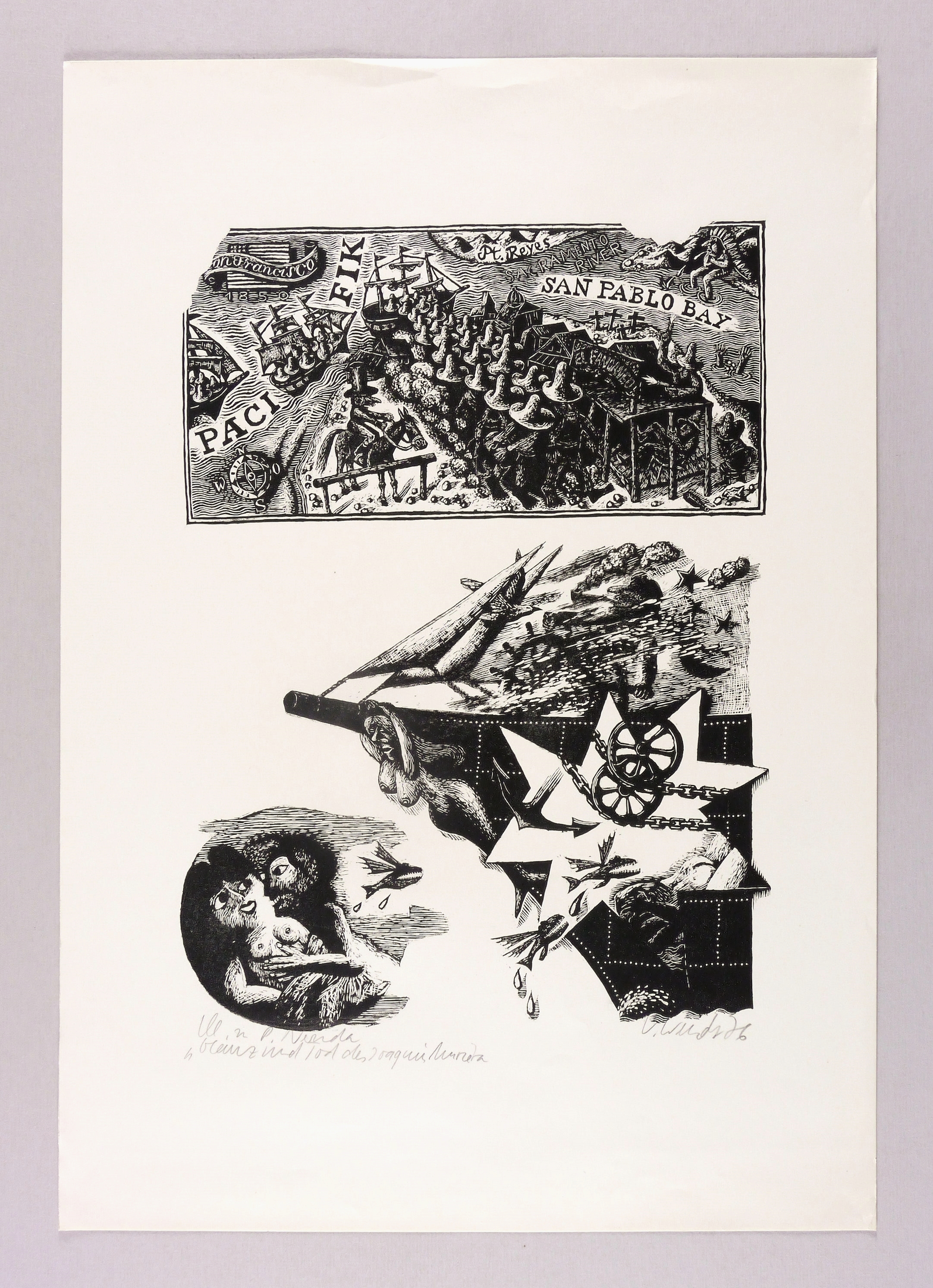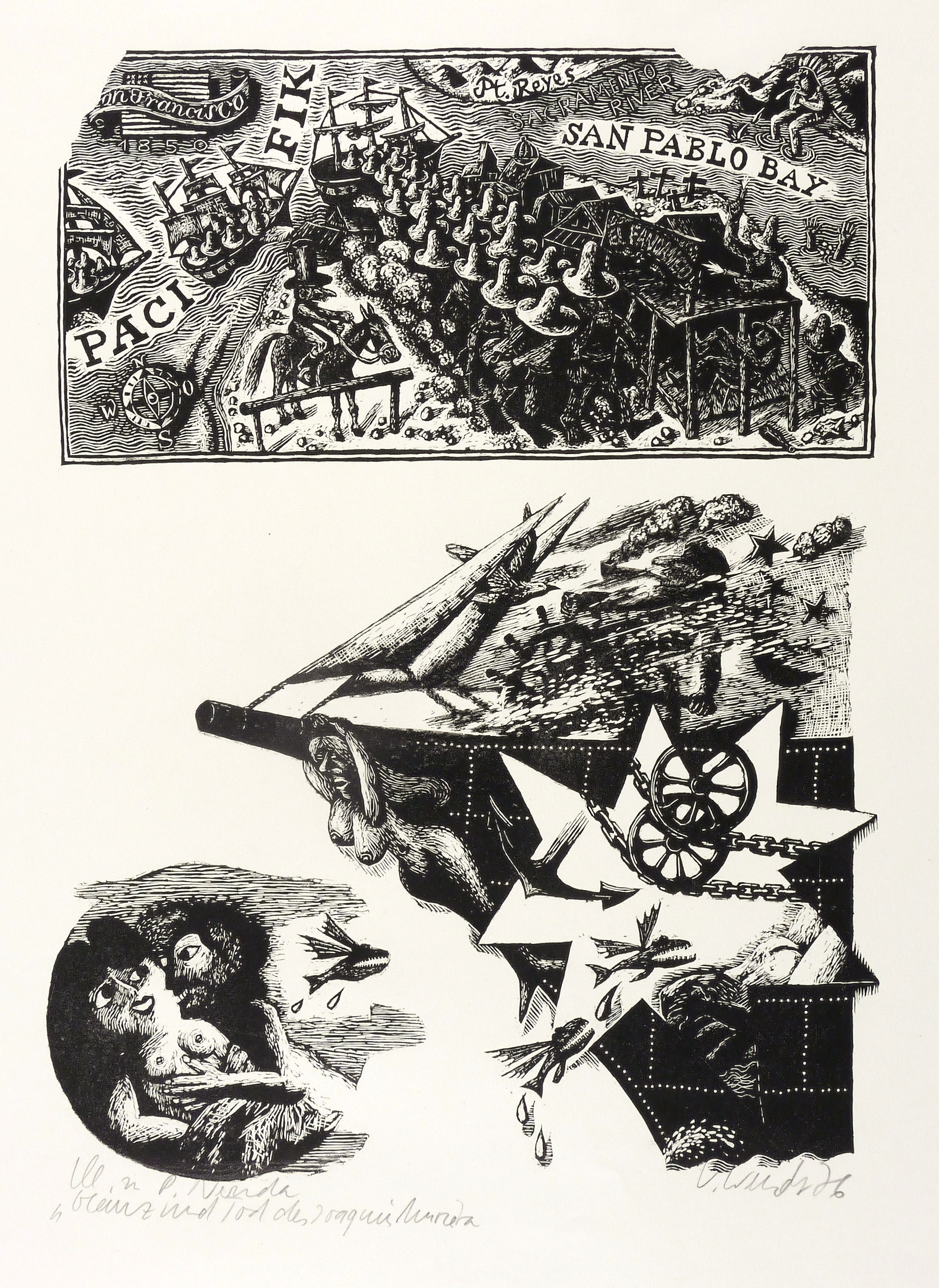 Rechts unten in Bleistift signiert und datiert: ″V. Wendt 76″. Links Titel: ″Ill. zu P. Neruda / Glanz und Tod des Joaquin Murieta″. – Papier im Randbereich unscheinbar griffspurig. Guter Zustand.