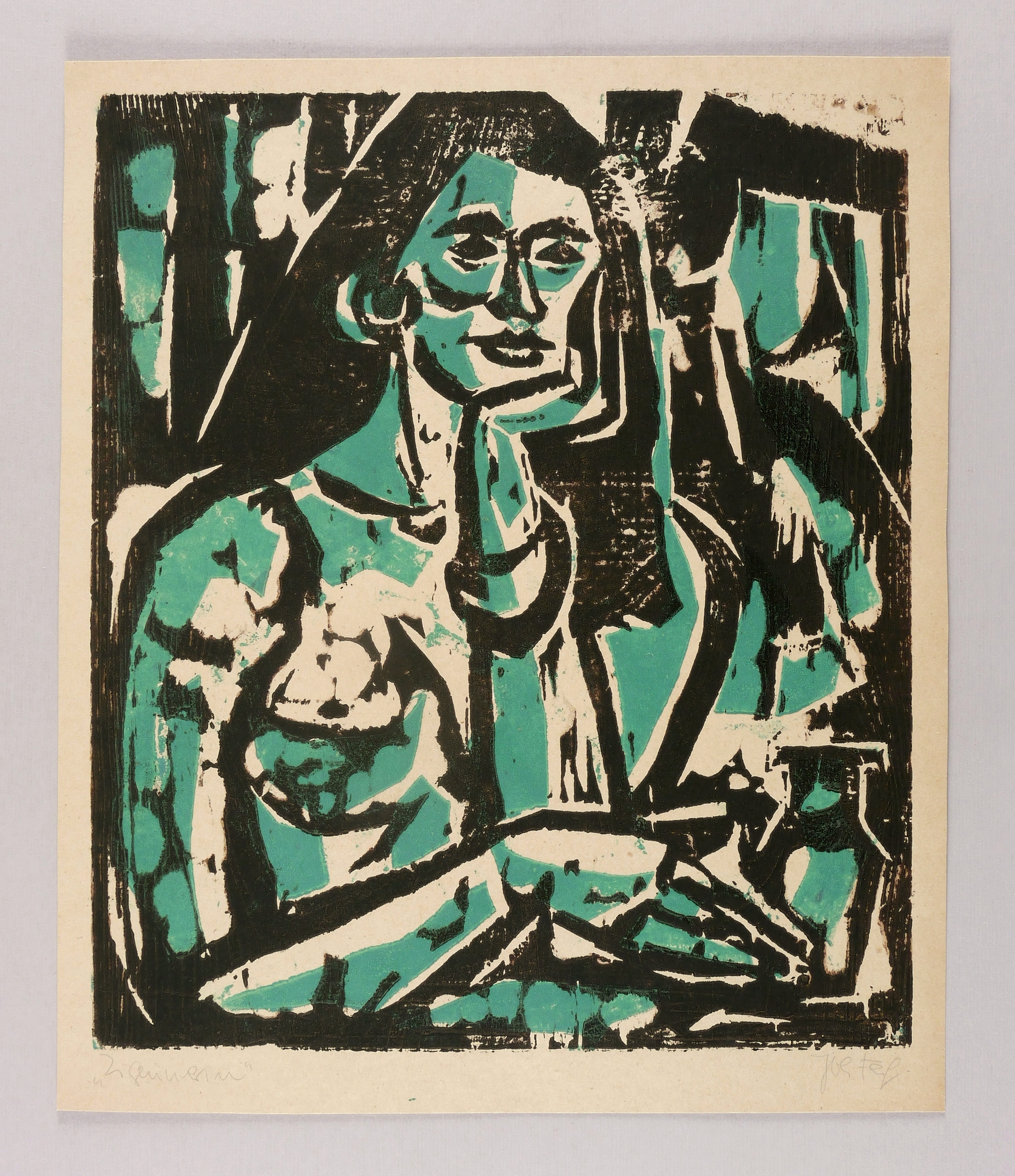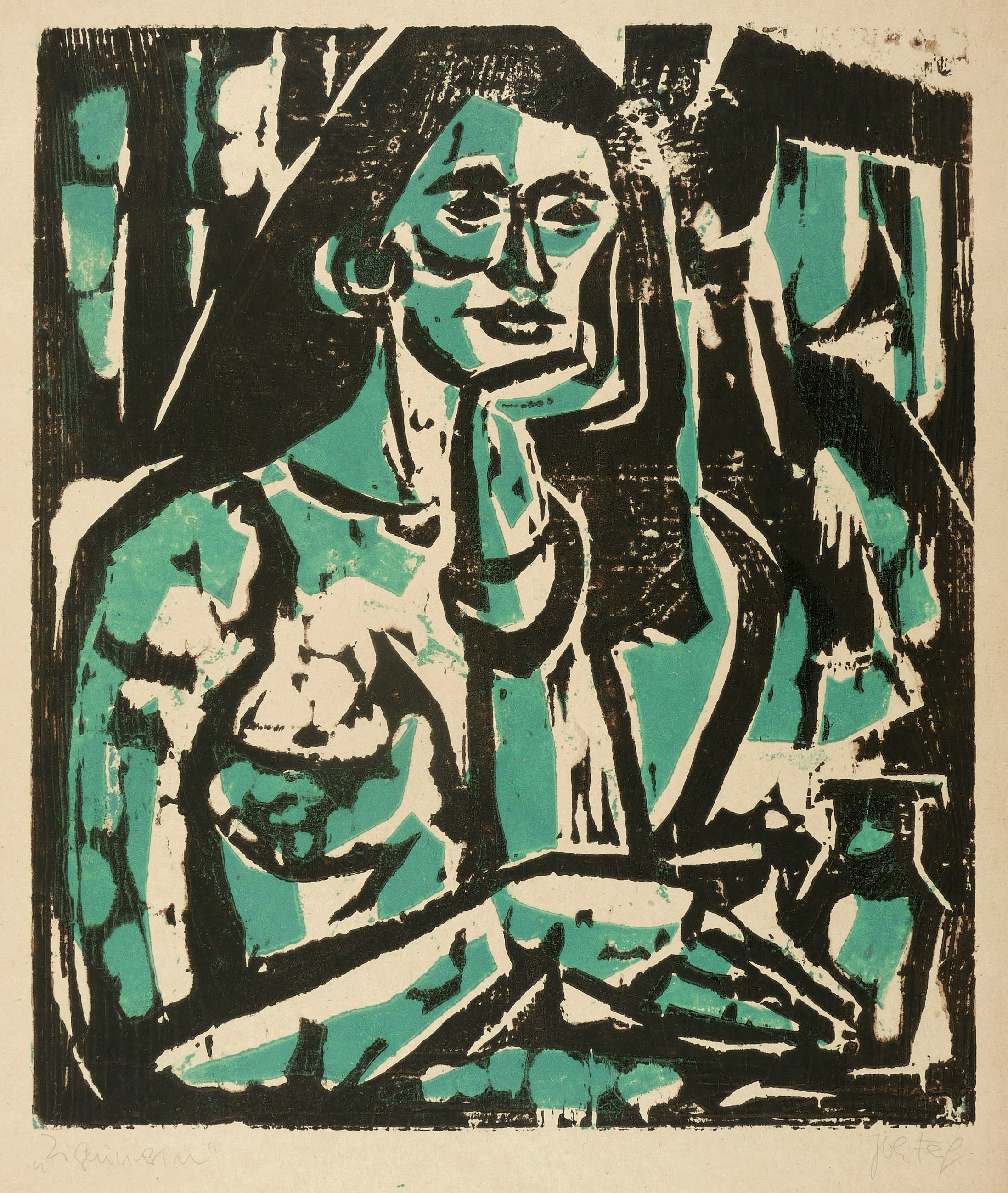 1983. Farbholzschnitt, in Grün & Schwarz, auf glattem gelbem Werkdruck. – Originale Künstlergrafik, von Johannes Feige. – 42,8 x 36,7 cm (Darstellung / Druckstock), 47 x 40 cm (Blatt).