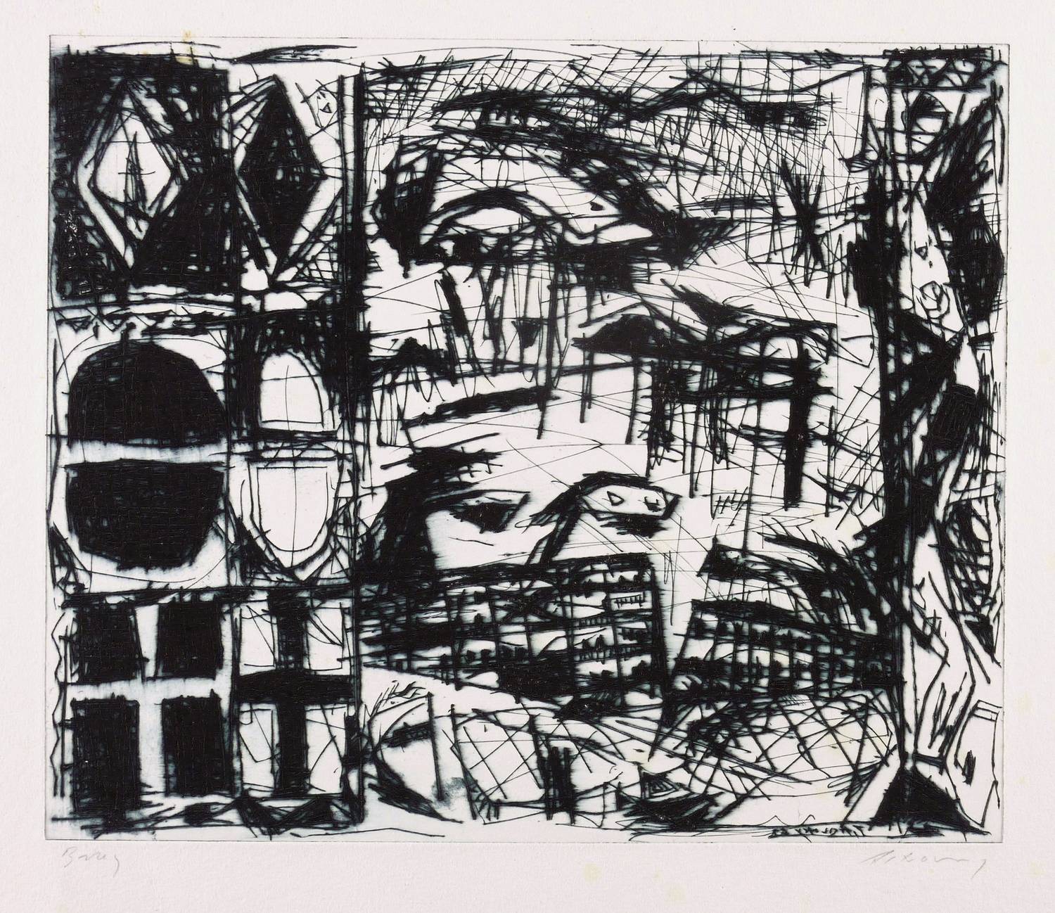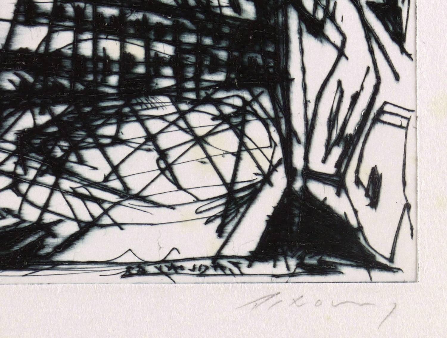 1982. Radierung / Kaltnadel, in Schwarzblau, auf kräftigem weißlichem Velin. – Originale Künstlergrafik, von Wolfgang Petrovsky. – Druckerexemplar. – 27,1 x 32,2 cm (Darstellung / Platte), 40 x 57 cm (Blatt).