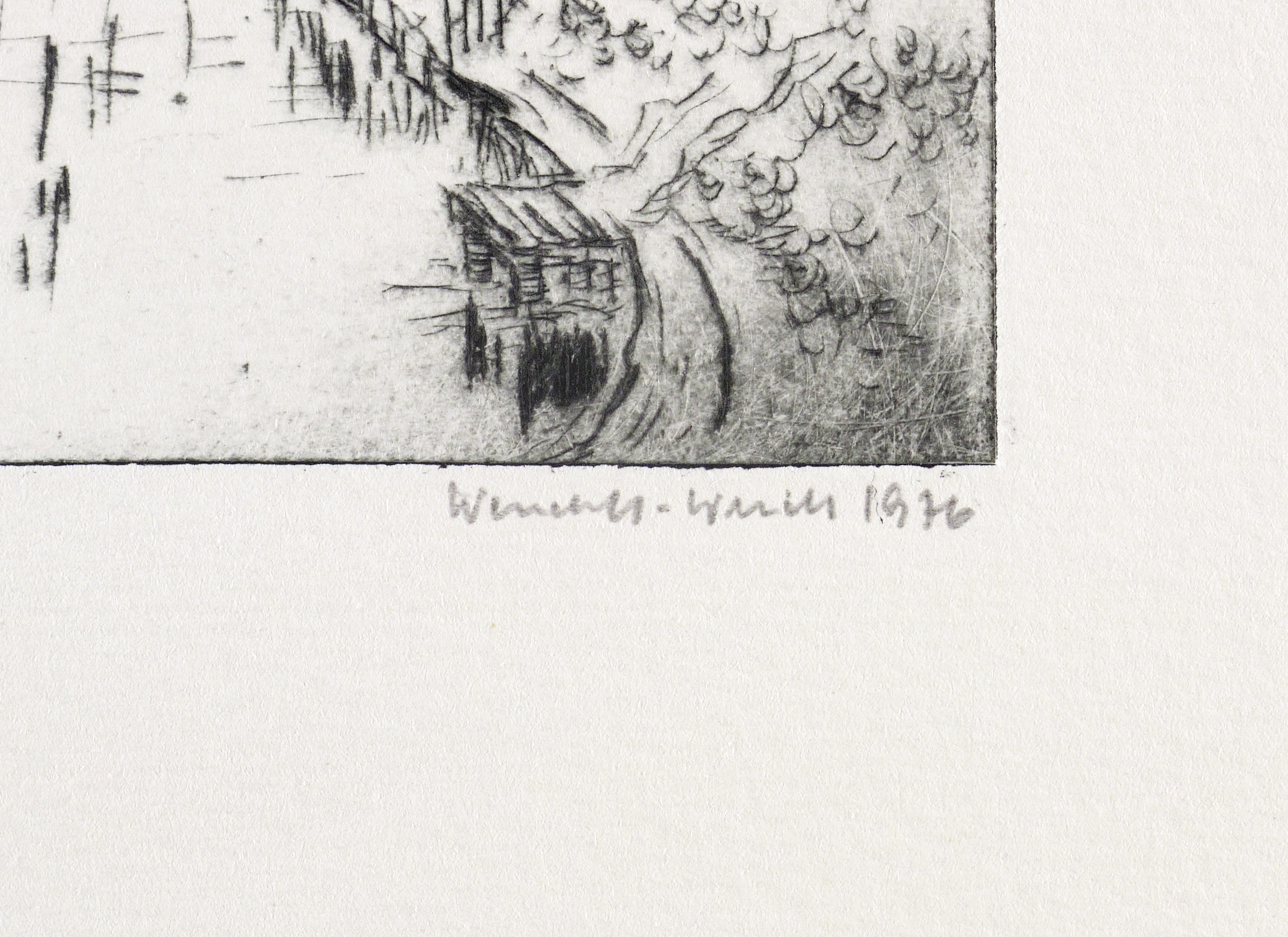 1976. Radierung / Strichätzung, in Schwarz, auf hartem hellchamois Weißenborn. – Originale Künstlergrafik, von Ursula Wendorf-Weidt. – Auflage Exemplar Nr. 28/30. – 9,2 x 12,8 cm (Darstellung / Platte), 16 x 20 cm (Blatt).