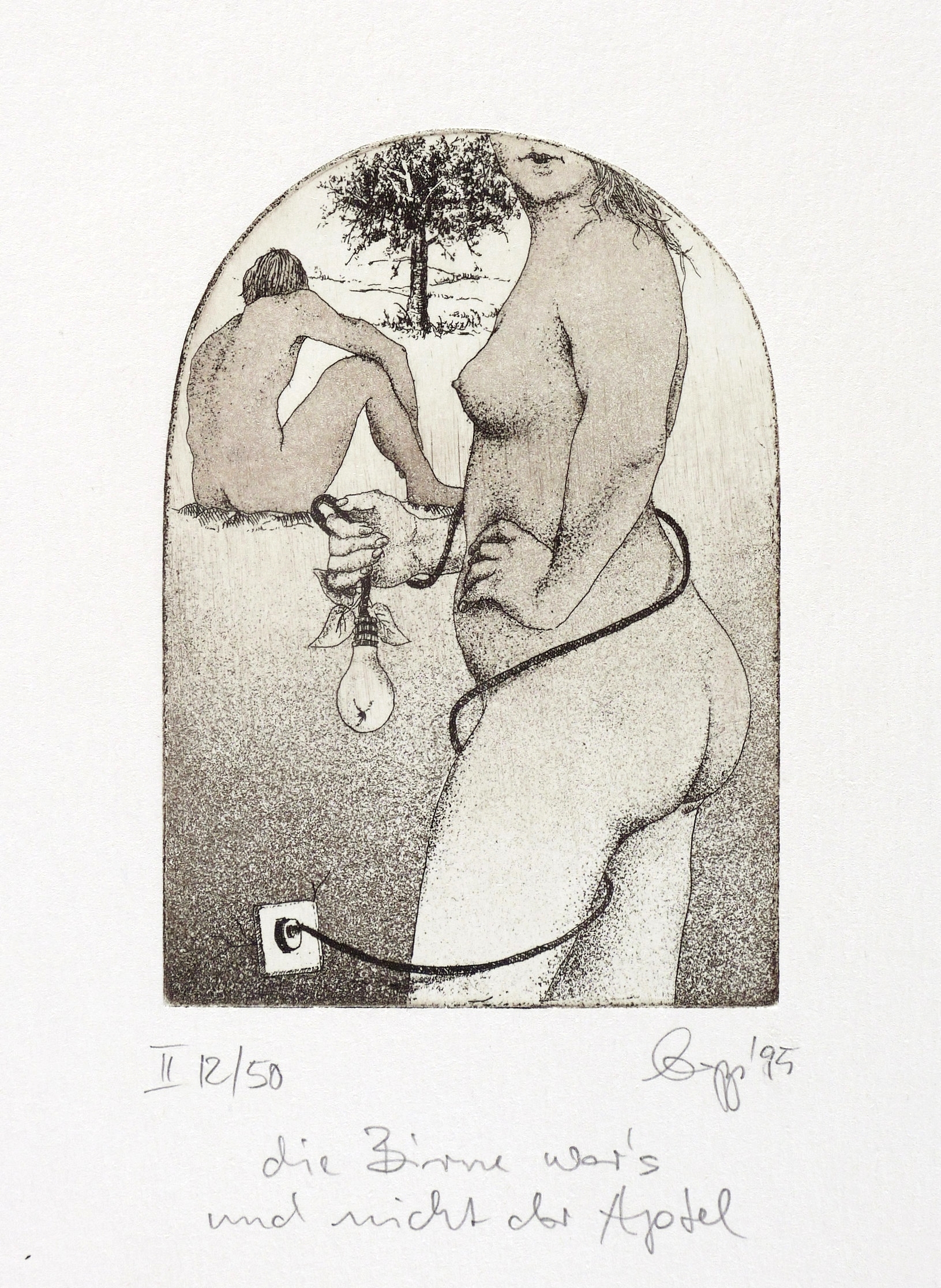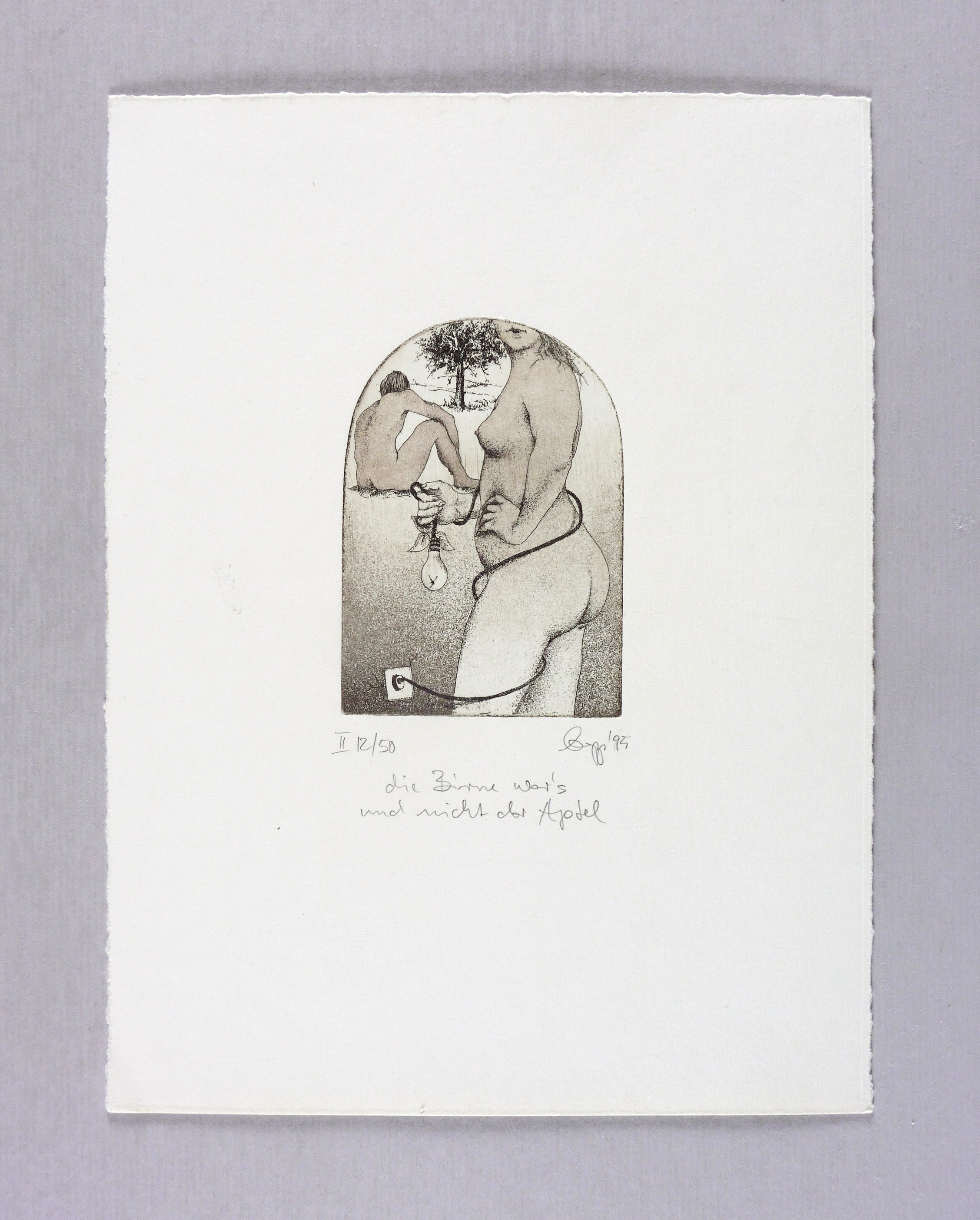 Rechts unten in Bleistift signiert und datiert: ″Gropp 95″. Links Auflagenbezeichnung: ″II 12/50″. Mittig darunter Titel: ″die Birne war's und nicht der Apfel″. – Sehr guter Zustand.