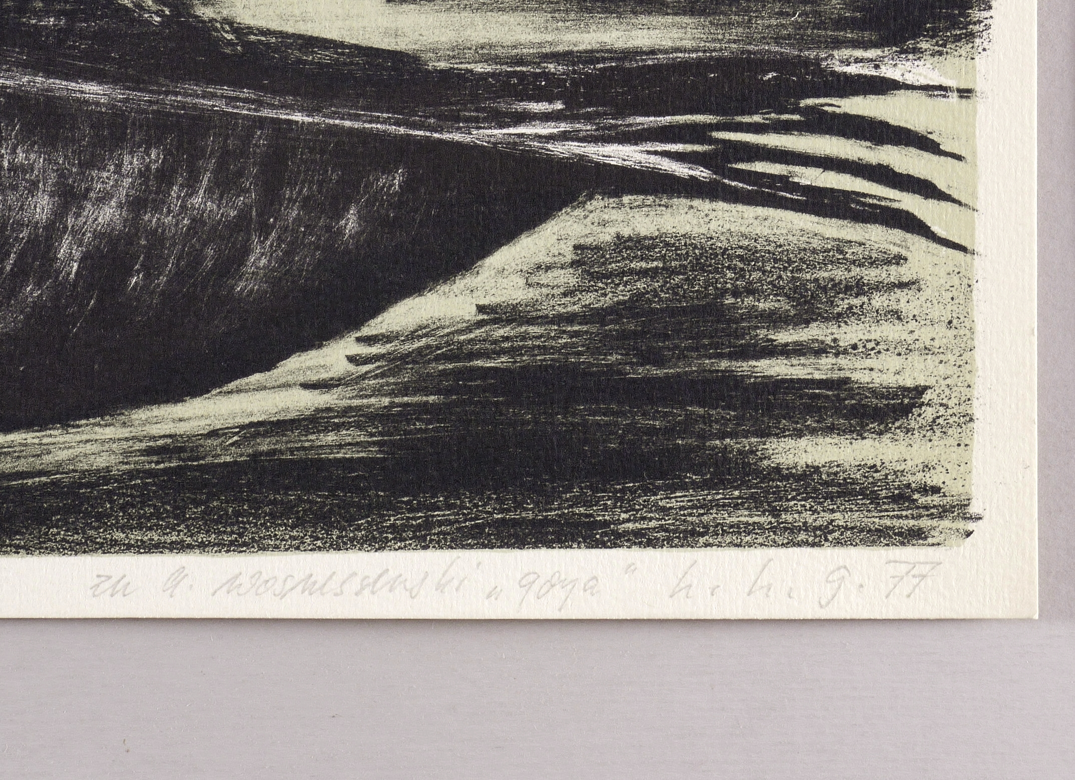 Rechts unten in Bleistift signiert und datiert: ″h.h.g. 77″. Daneben Titel: ″zu A. Wosnessenski 'Goya'″. Links eigenhändige Auflagenbezeichnung: ″132/150″. – Sehr guter Zustand.
