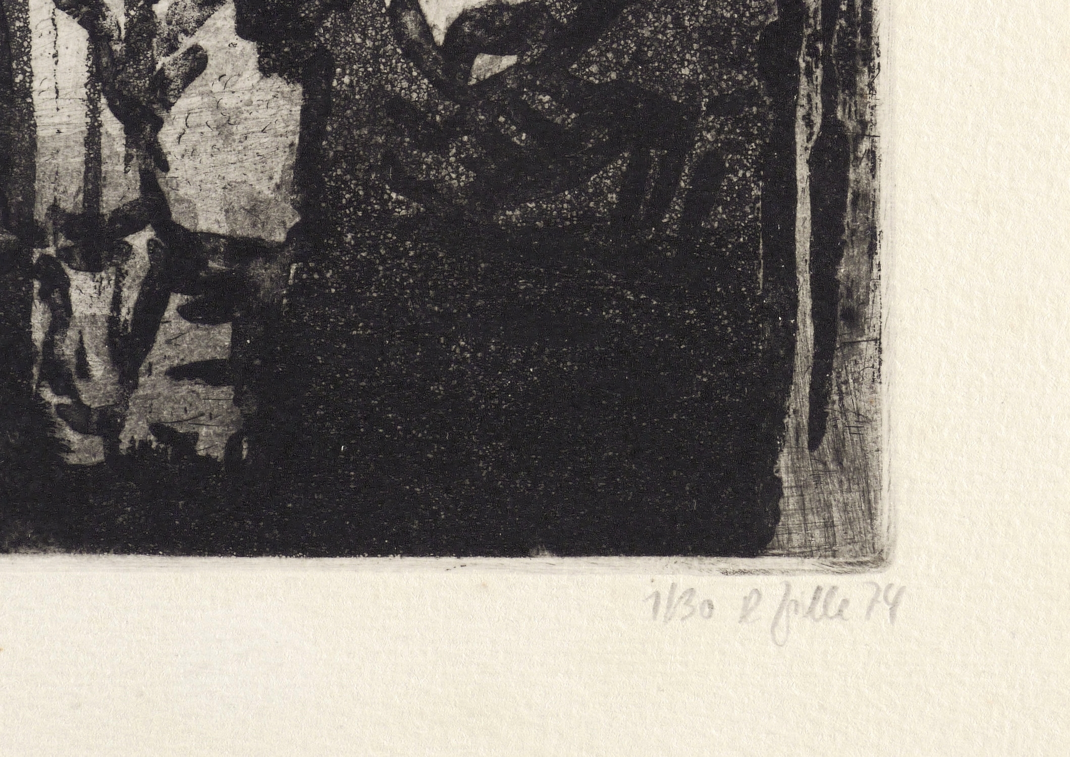 1974. Radierung / Aquatinta & Reservage, in Schwarz, auf hartem hellchamois Weißenborn. – Originale Künstlergrafik, von Rainer Zille. – Auflage Exemplar Nr. 1/30. – 28 x 36 cm (Blatt), 24,4 x 30,9 cm (Darstellung / Platte).
