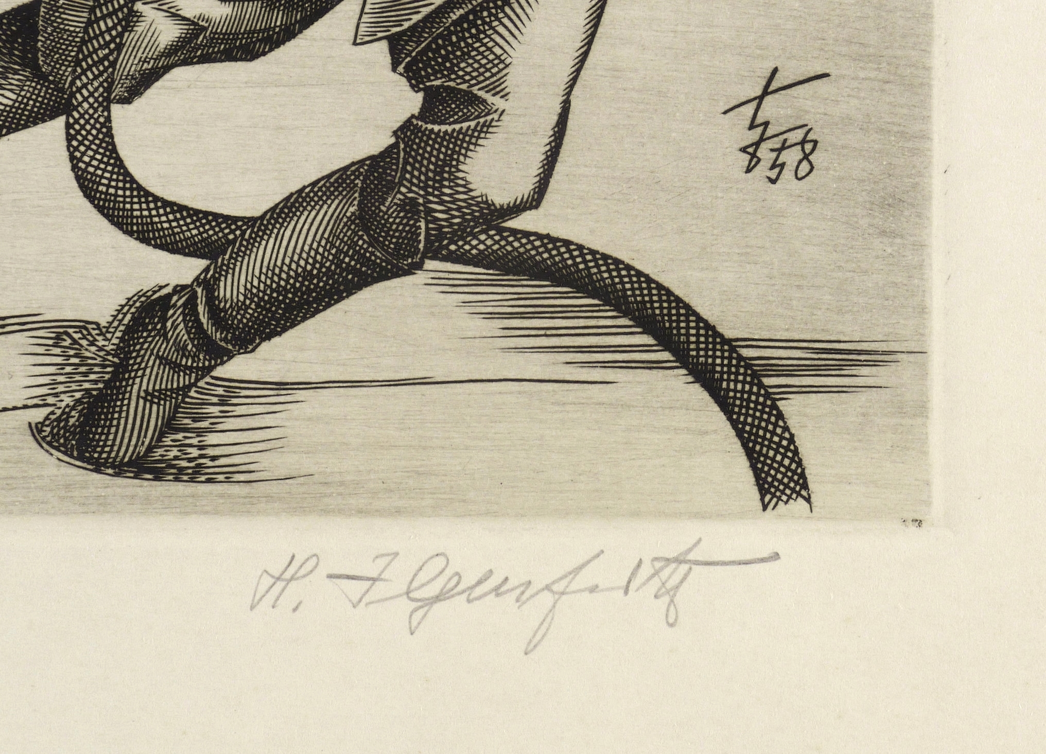 1958. Kupferstich / Linienstich, in Schwarz, auf festem gelbem Velinkarton. – Originale Künstlergrafik, von Heinrich Ilgenfritz. – 20,2 x 29,4 cm (Darstellung / Platte), 29 x 39 cm (Blatt).