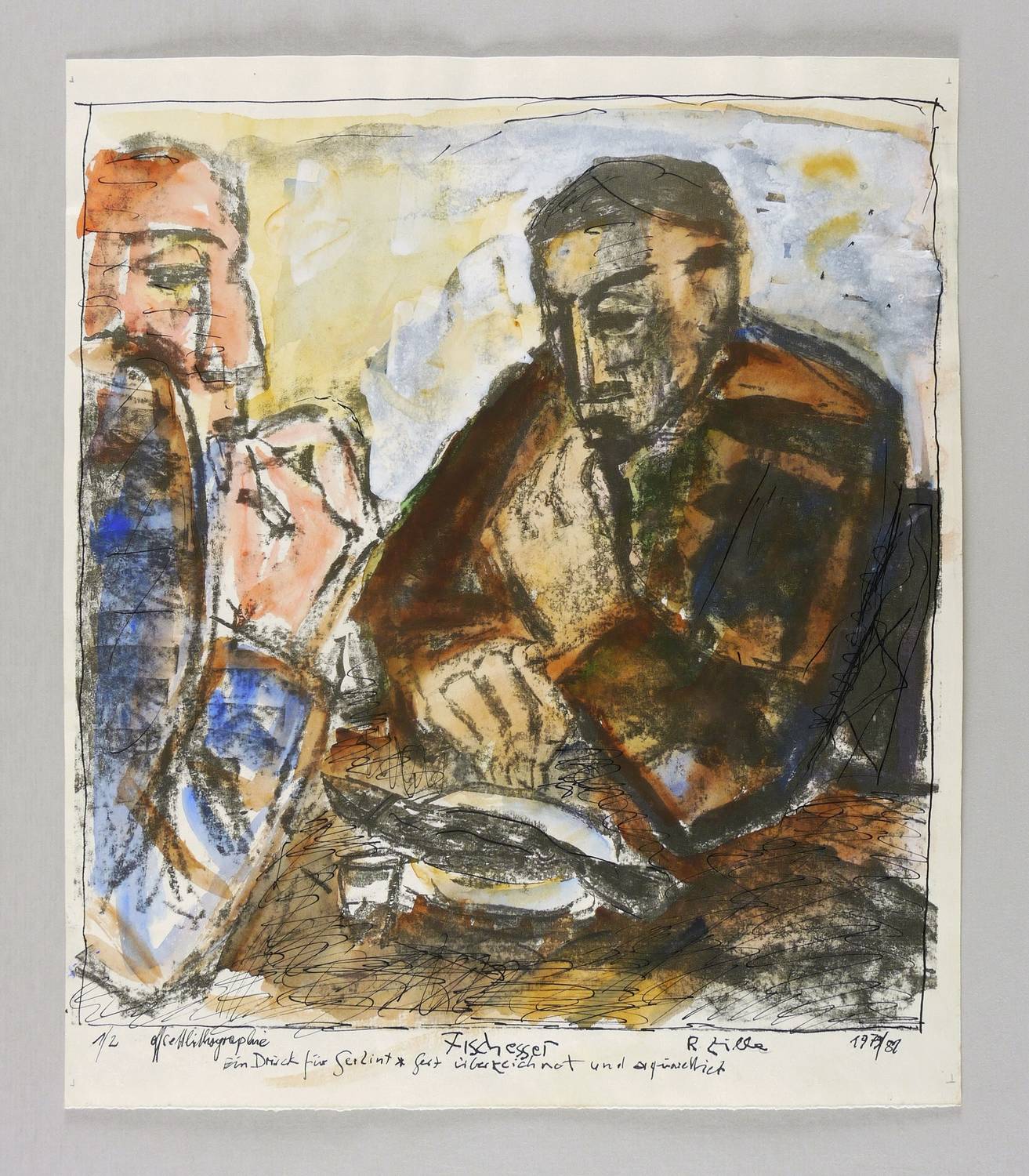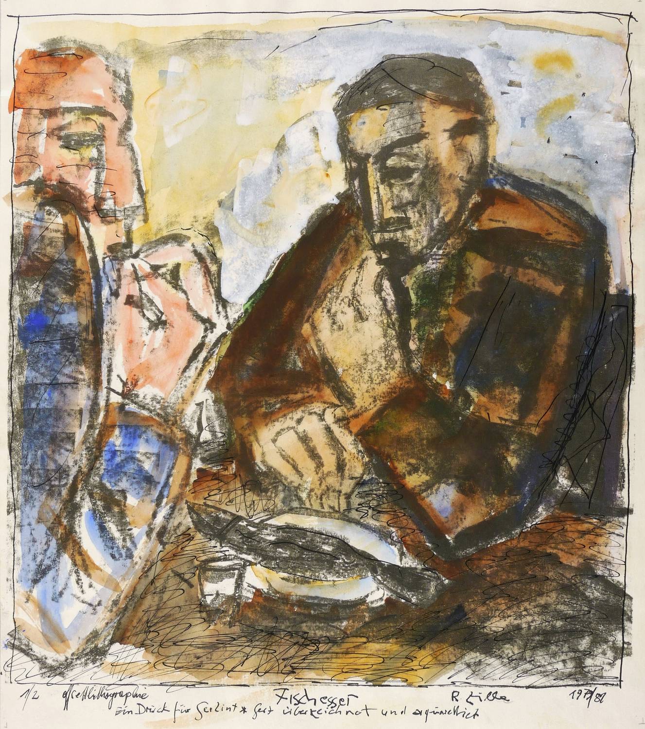 Rechts unten mit Faserstift signiert und datiert: ″R. Zille 1979/82″. Links Auflagen- und Technikbezeichnung: ″1/2 Offsetlithografie″. Mittig Titel: ″Fischesser″. Darunter Widmung. – Provenienz: Sammlung Gerlint und Gert Söder, Dresden. – Sehr guter Zustand.