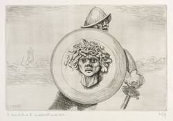 1965. Radierung / Strichätzung, in Schwarz, auf hellchamois Velinkarton. – Originale Künstlergrafik, von Hans Escher. – Auflage Exemplar Nr. 1/30. – 19,5 x 29,7 cm (Darstellung / Platte), 35 x 42 cm (Blatt).
