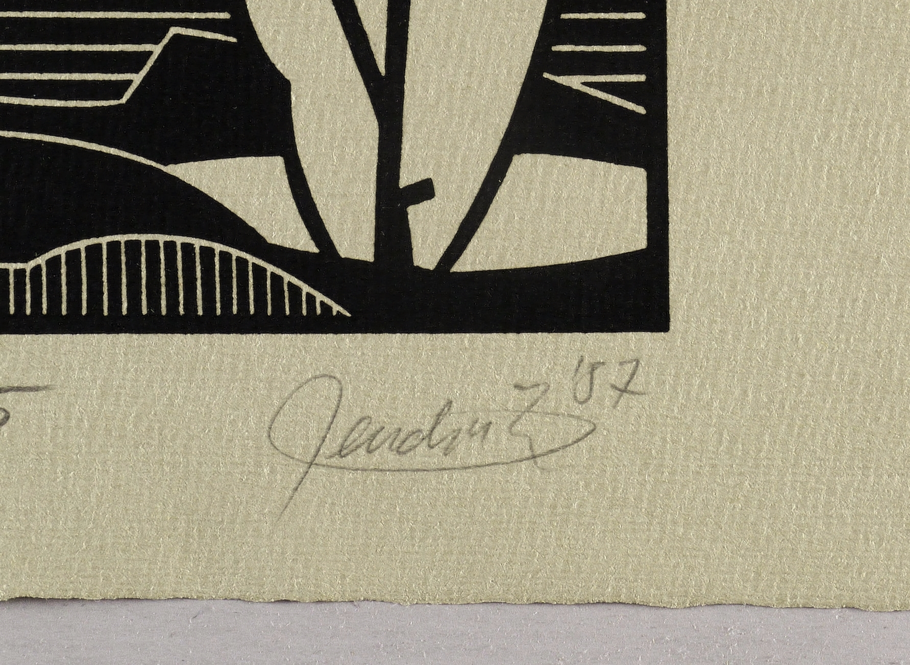 1987. Linolschnitt, in Schwarz, auf graugrün getöntem Hahnemühle. – Originale Künstlergrafik, von Hendrik Hause. – Auflage Exemplar Nr. 1/65. – 6,5 x 8,4 cm (Darstellung / Druckbild), 11 x 15 cm (Blatt).