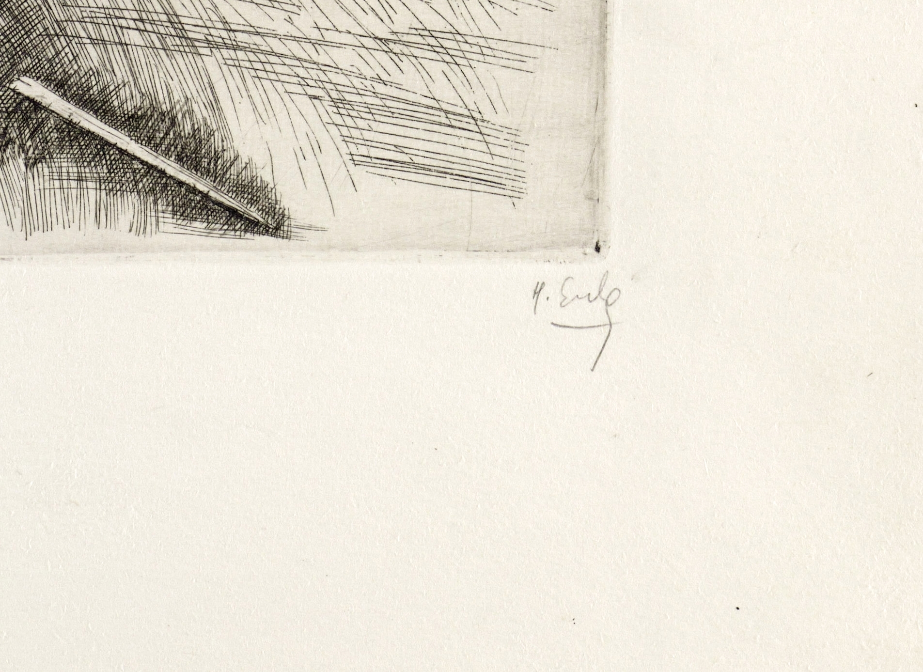 1965. Radierung / Strichätzung, in Schwarz, auf hellchamois Velinkarton. – Originale Künstlergrafik, von Hans Escher. – Auflage Exemplar Nr. 1/30. – 19,7 x 29,8 cm (Darstellung / Platte), 35 x 42 cm (Blatt).