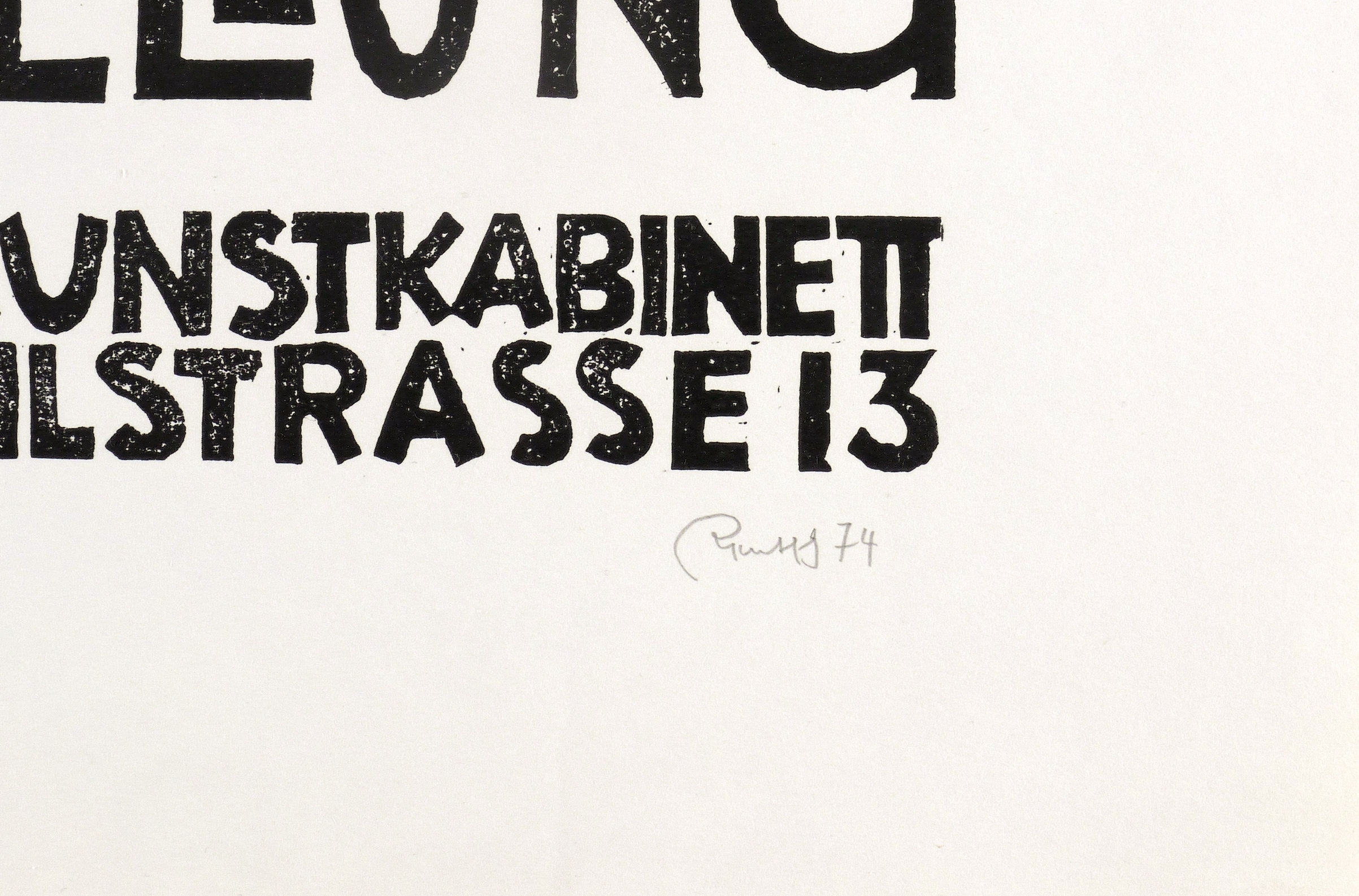 1974. Linolschnitt, in Schwarz, auf leichtem hellchamois Werkdruck. – Originales Künstlerplakat, von Lothar Rentsch. – 10,8 x 10,7 cm (Darstellung / ohne Schrift), 60 x 42 cm (Blatt).