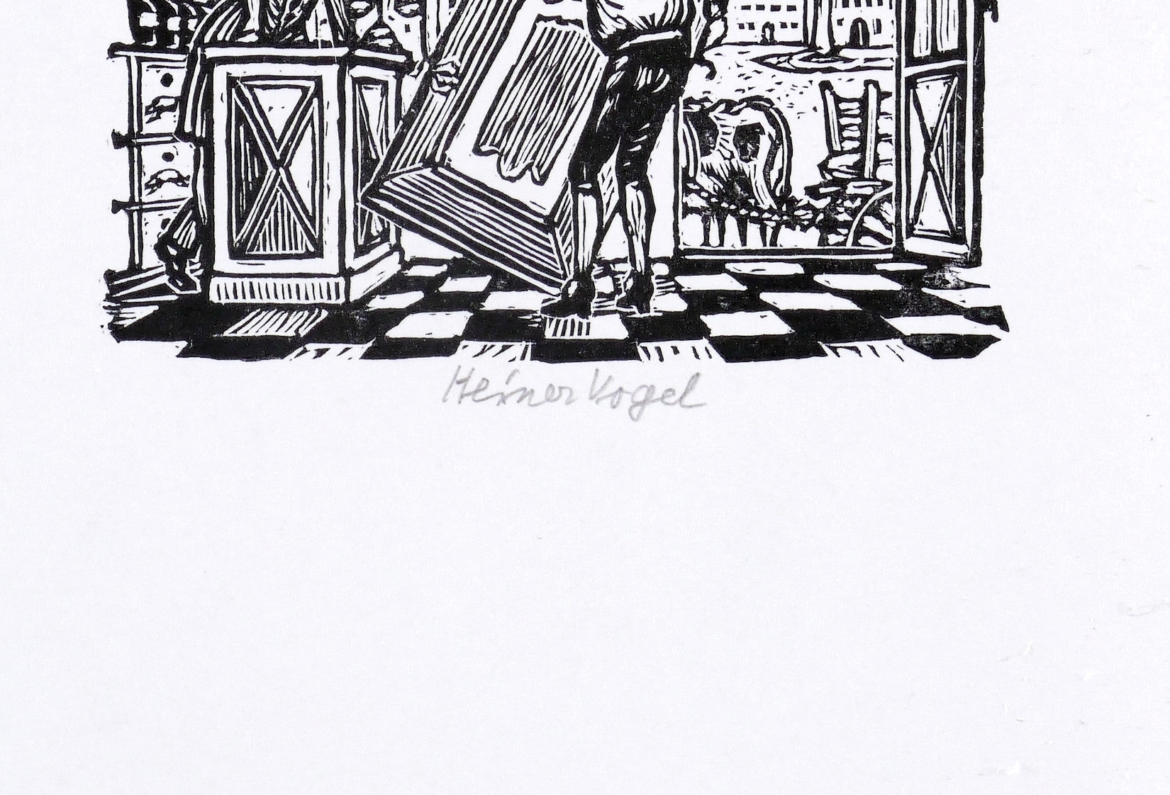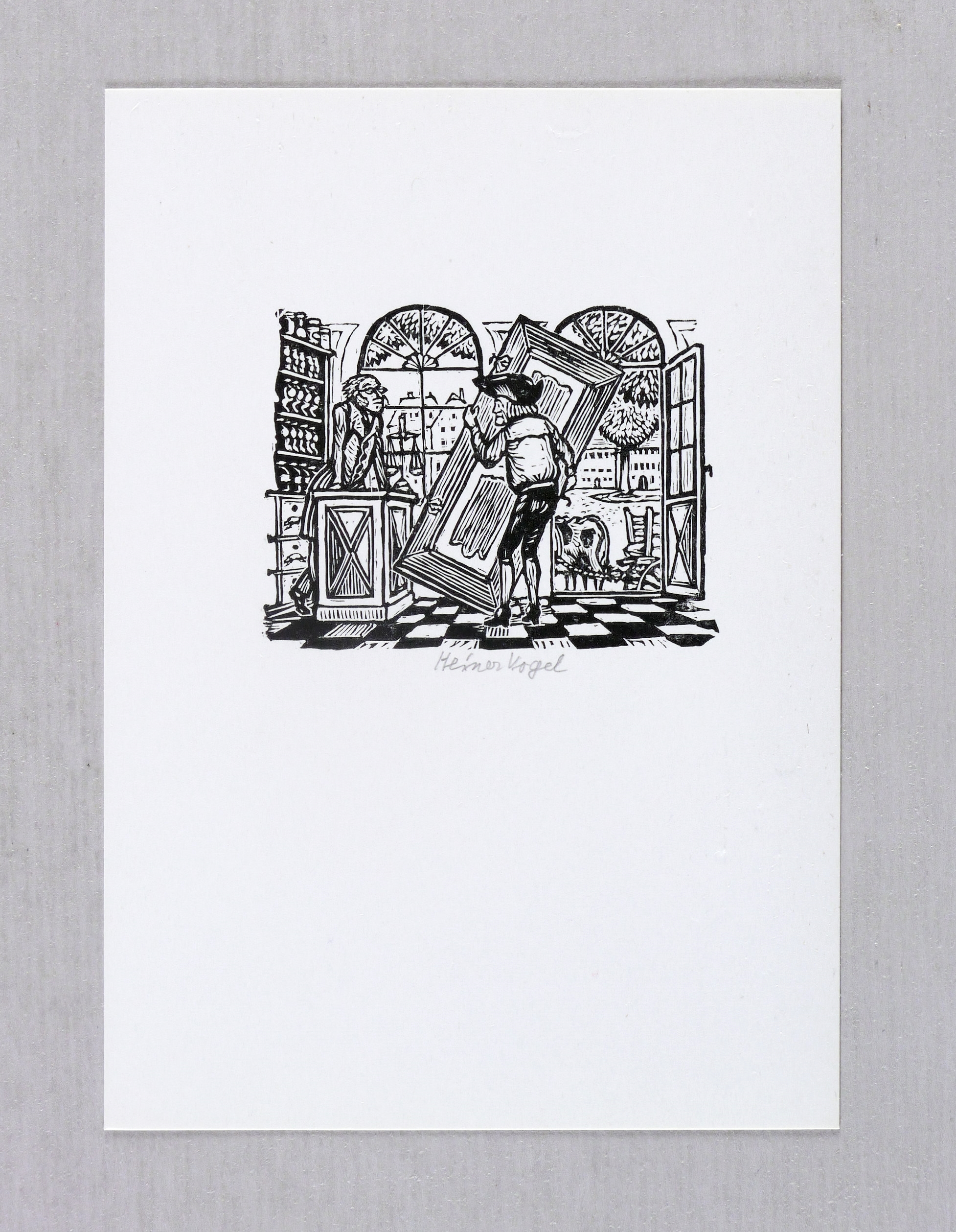 1981/1982. Holzschnitt, in Schwarz, auf glattem hellchamois Velin. – Originale Künstlergrafik, von Heiner Vogel. – 5,0 x 6,6 cm (Darstellung / Druckbild), 15 x 11 cm (Blatt).