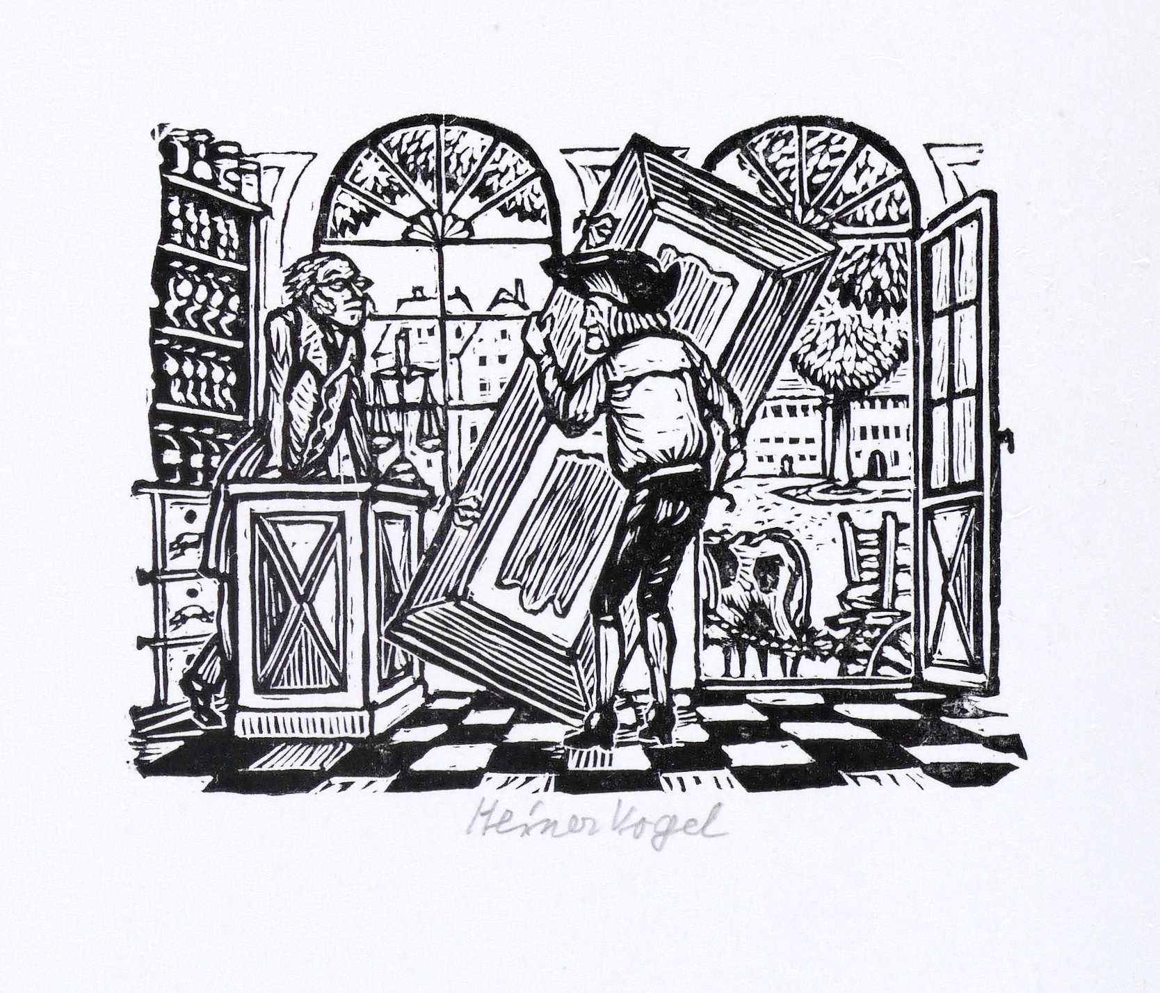 Heiner Vogel (*1925 Calbe, lebt in Leipzig). Deutscher Grafiker, Illustrator und Autor. 1946-52 Lehre und Tätigkeit als Bandagist . 1952-57 Studium an der Hochschule für Graphik und Buchkunst Leipzig, Fachklasse Buchgestaltung. 1957 Diplomarbeit mit Holzstich-Illustrationen zu Ringelnatz. 1963-65 Aspirant am Ausbildungsinstitut. Seit 1963 freischaffend. Illustrierte unter anderem für die Insel-Bücherei und die Sammlung Dieterich. Sammelte historische Kinderbücher und volkstümliche Grafik. Autor des Buches 'Bilderbogen, Papiersoldat, Würfelspiel und Lebensrad'. Erfinder des Leipziger Bilderbogens.