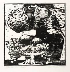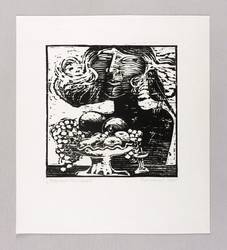 1975. Holzschnitt, in Schwarz, auf leichtem hellchamois Velin. – Originale Künstlergrafik, von Thea Kowar. – 19,6 x 19,3 cm (Darstellung / Druckbild), 32 x 29 cm (Blatt).