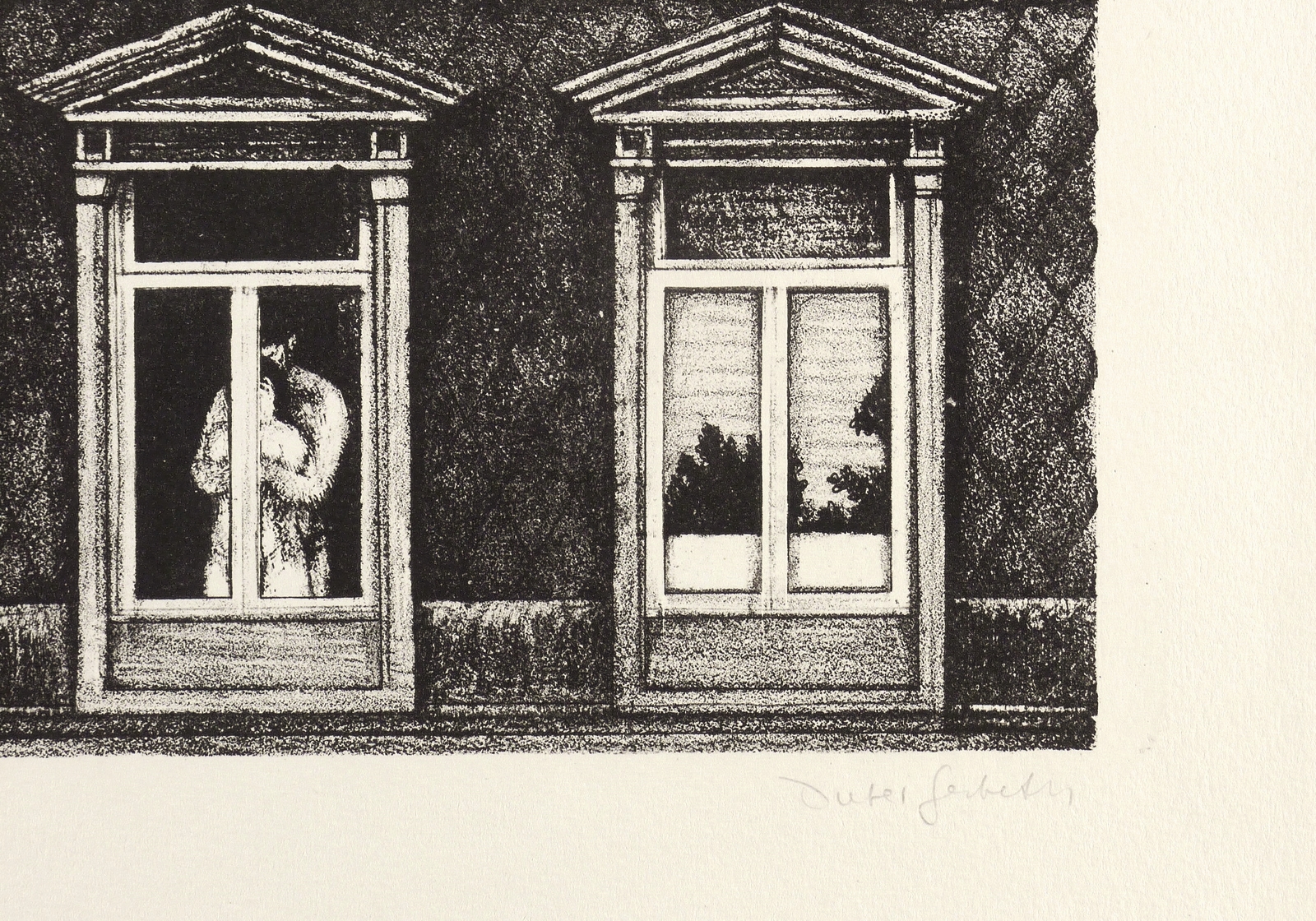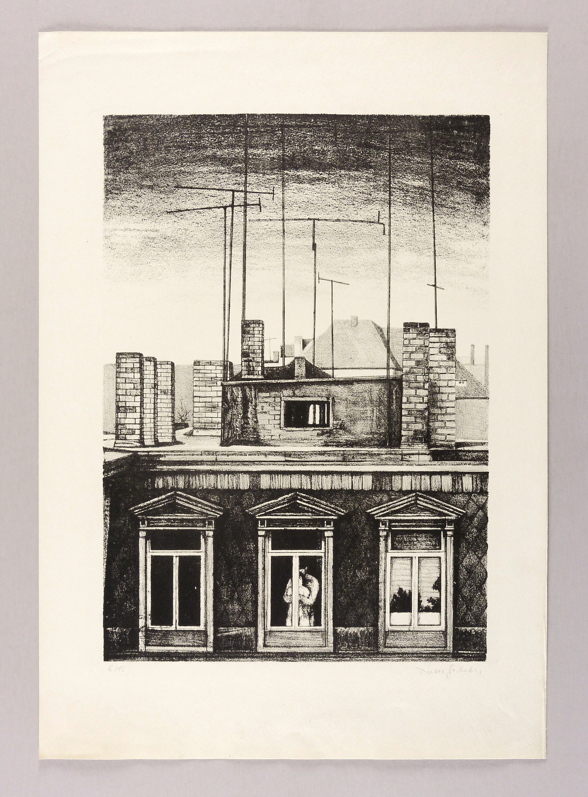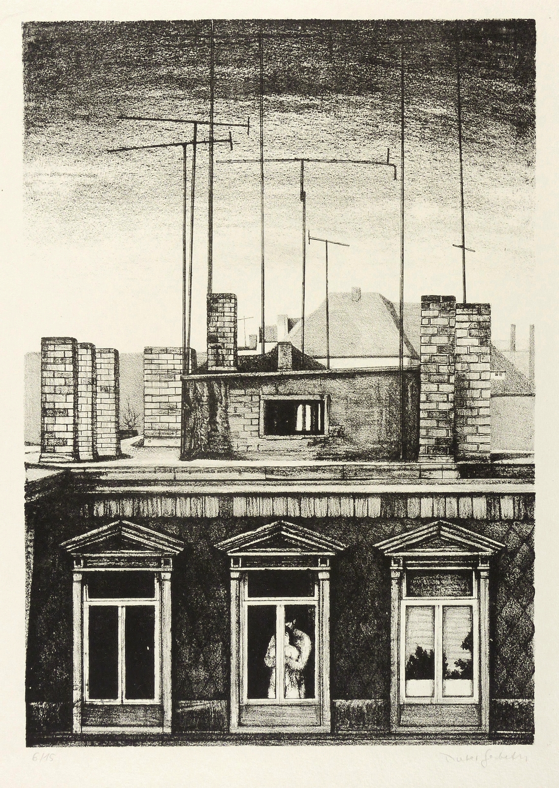 Rechts unten in Bleistift signiert: ″Dieter Gerbeth″. Links Auflagenbezeichnung: ″6/15″. – Beigabe: Zeitungsartikel ″Dieter Gerbeth: 'Dächer', Lithographie″ von Klaus Werner in der Berliner Zeitung vom 2. September 1973 (Rubrik: BZ-Grafik 73 gesucht). Dazu handschriftlicher Brief von Dieter Gerbeth an den Vorbesitzer der Grafik vom 12. Dezember 1973, in dem er bedauert, besagte Grafik nicht abgeben zu können, da die wenigen 15 Exemplare der Auflage wegen des Artikels in der BZ schon verkauft wurden. – Sehr guter Zustand.