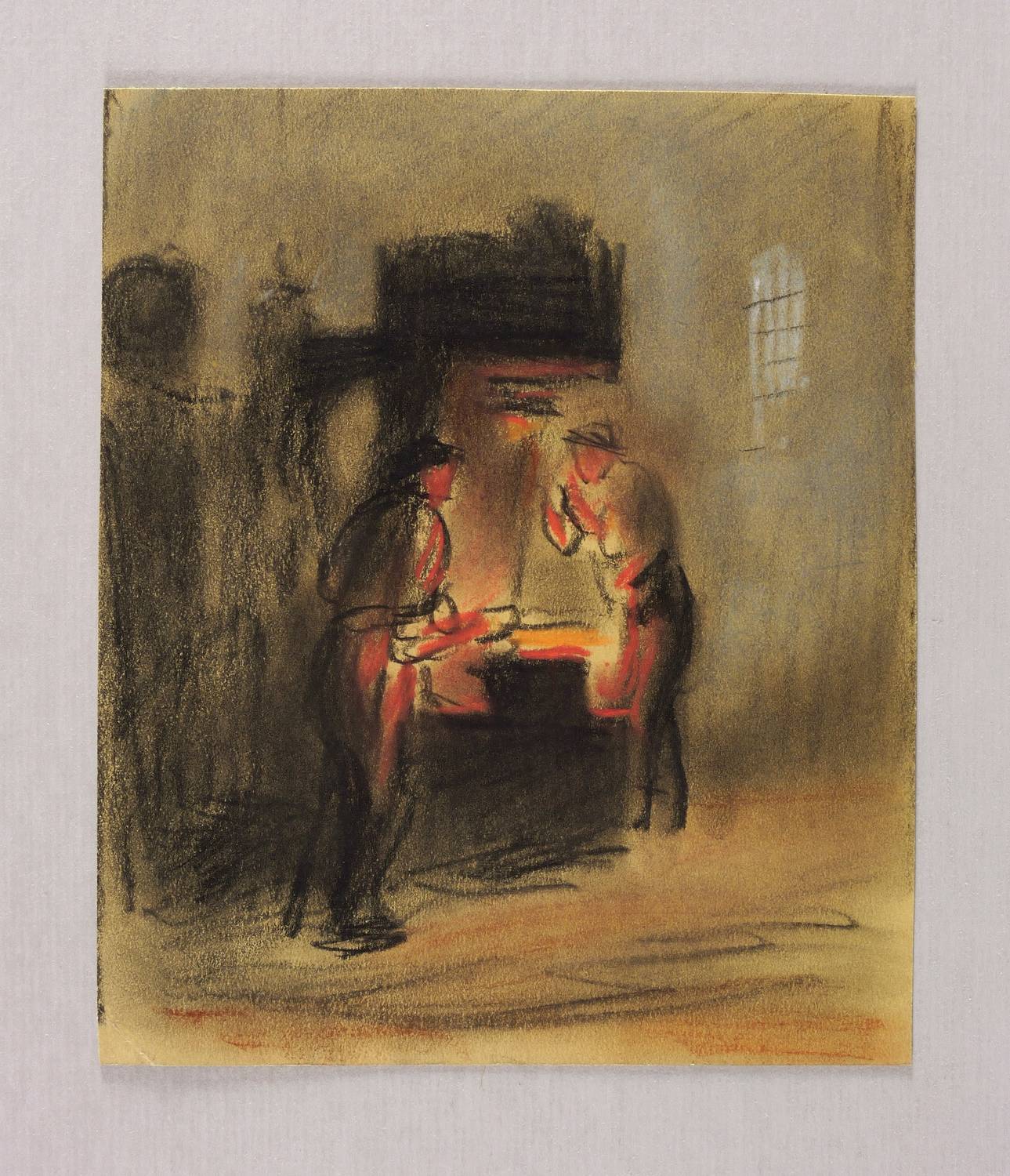 1940-1950. Zeichnung / Kohle & Pastellkreide, auf glattem gelbem Velin. – Originale Künstlergrafik, von Karl Enderlein. – Unikat. – 19,0 x 15,7 cm (Darstellung / Blatt).