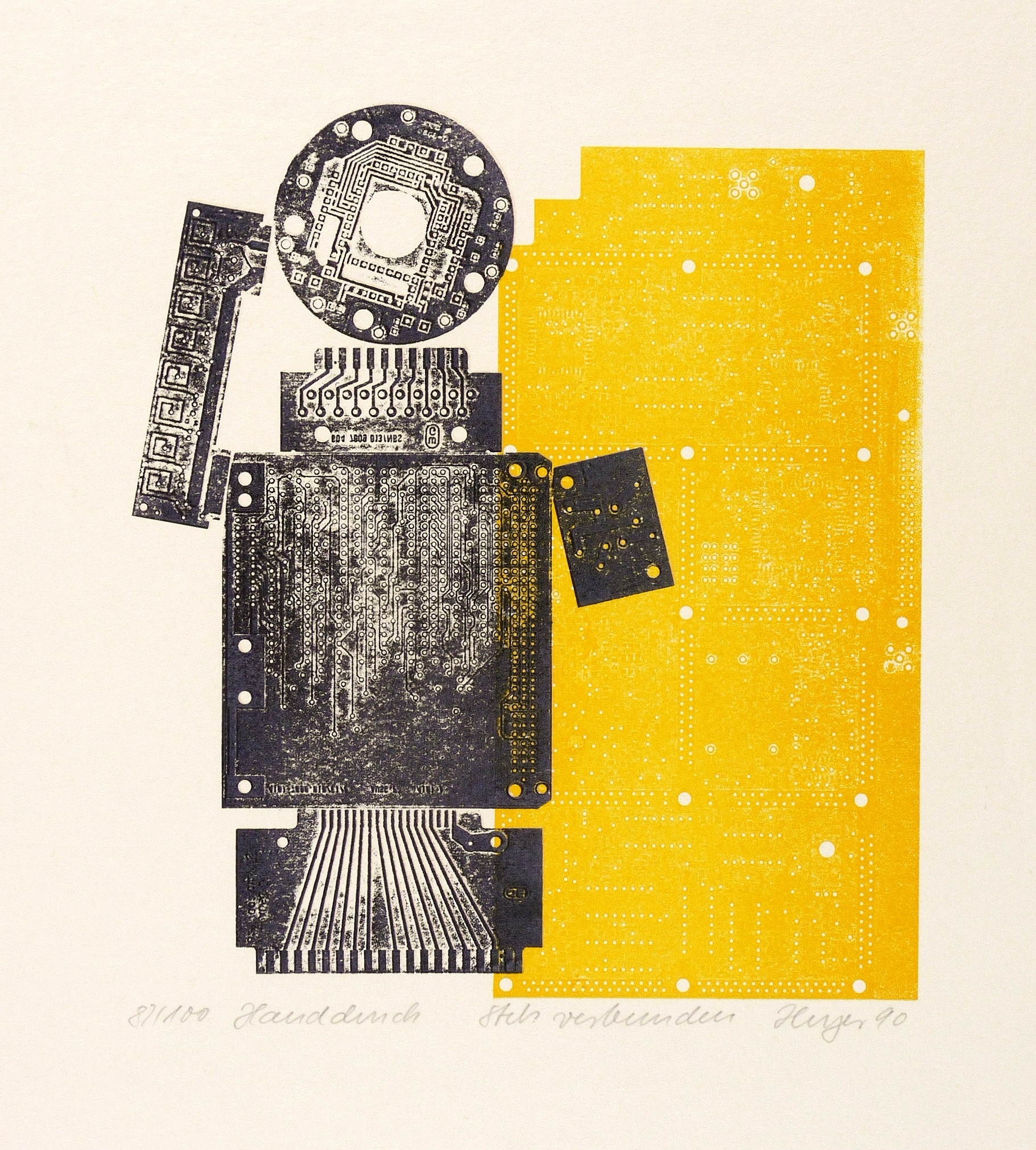 1990. Materialdruck, in Gelb & Schwarz, auf hellchamois Velin. – Originale Künstlergrafik, von Deutsch (20. Jh.). – Auflage Exemplar Nr. 82/100. – 25,4 x 22,3 cm (Darstellung / Druckbild), 50 x 40 cm (Blatt).