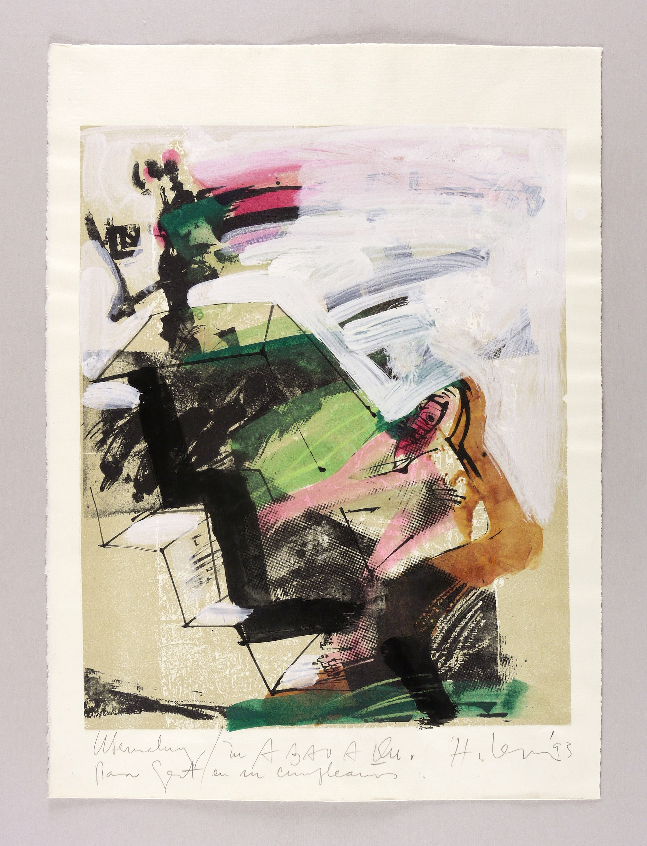 1993. Mischtechnik / Tusche, Aquarell & Deckweiß, über Farblithografie, auf hellchamois Velin. – Originale Künstlergrafik, von Hernando León. – Unikat. – 43,0 x 34,5 cm (Darstellung), 54 x 40 cm (Blatt).