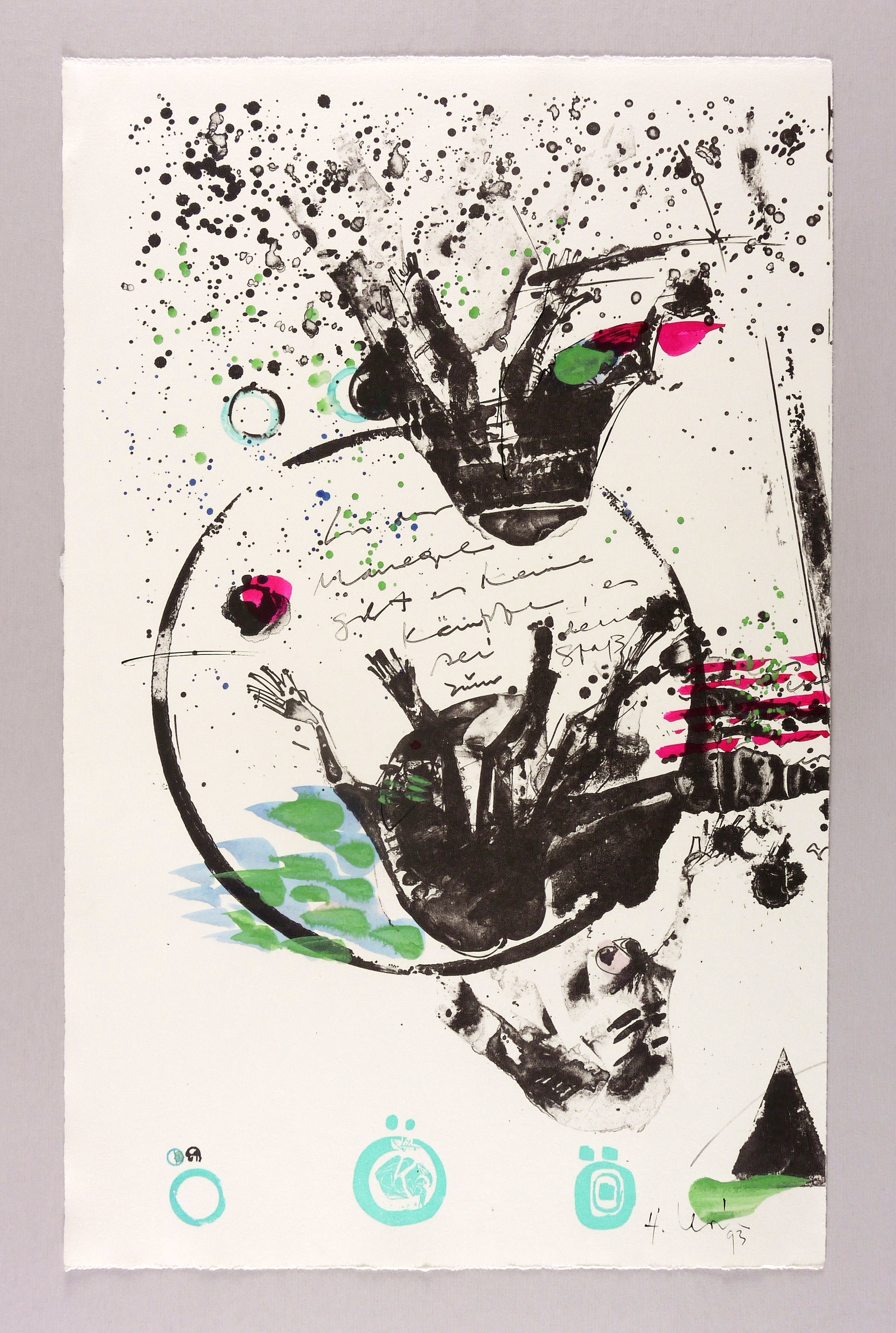 1993. Mischtechnik / Algrafie & Stencil, in Aquarell & Deckfarben koloriert, auf hellchamois Velin. – Originale Künstlergrafik, von Hernando León. – Unikat. – 60,5 x 38,5 cm (Darstellung / Blatt).