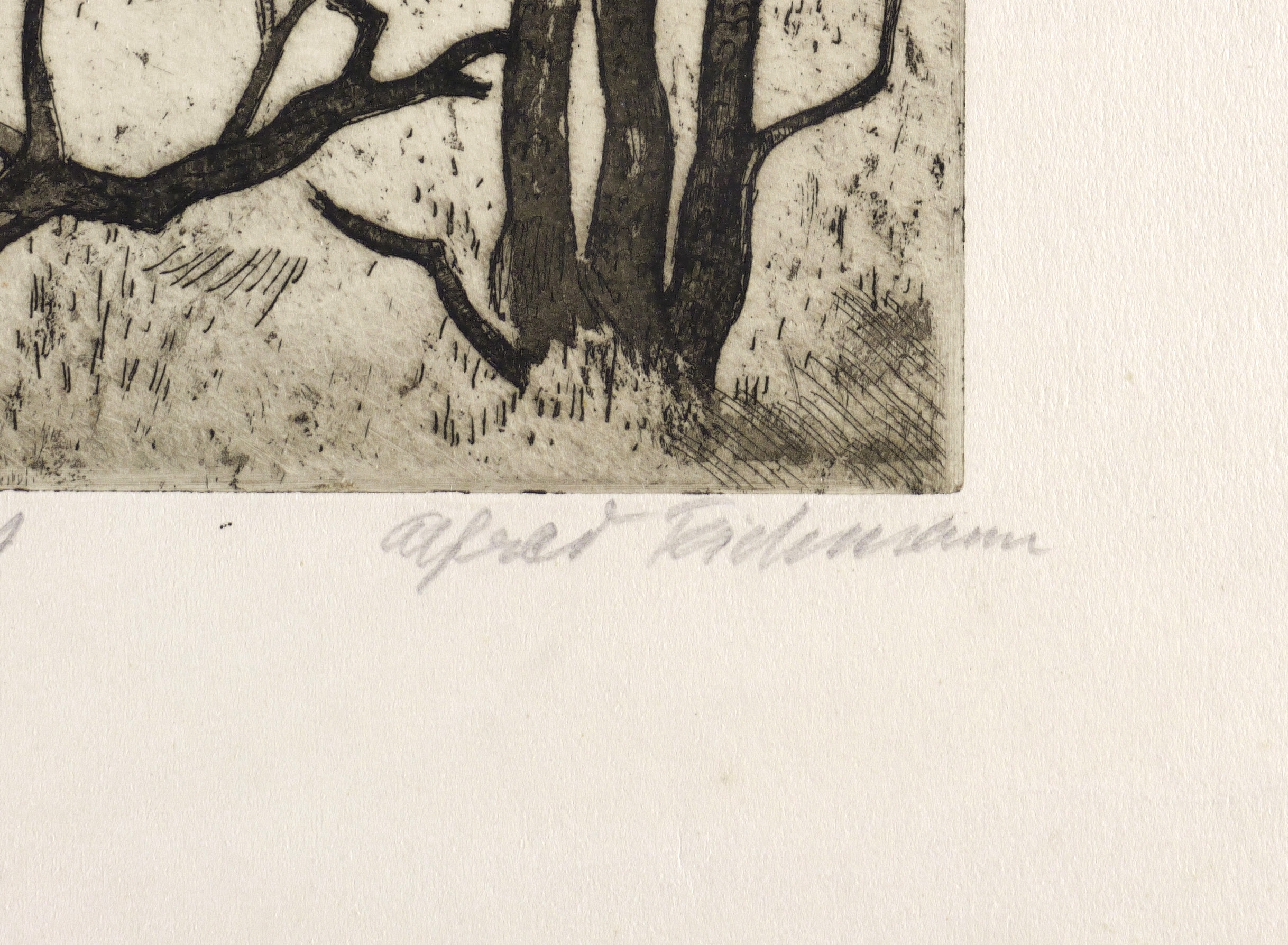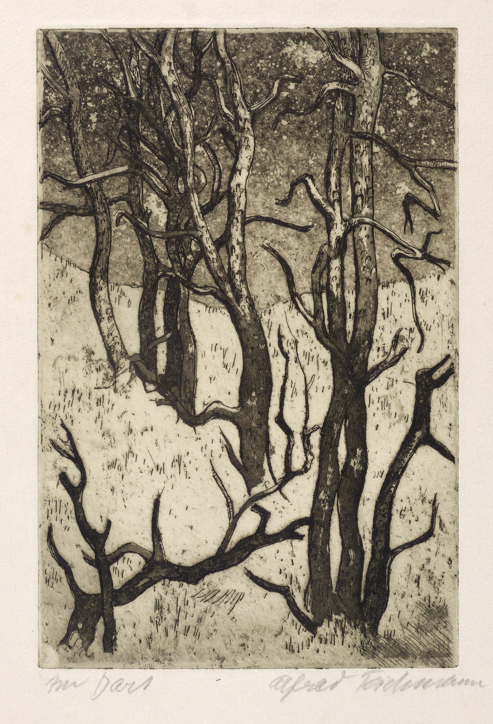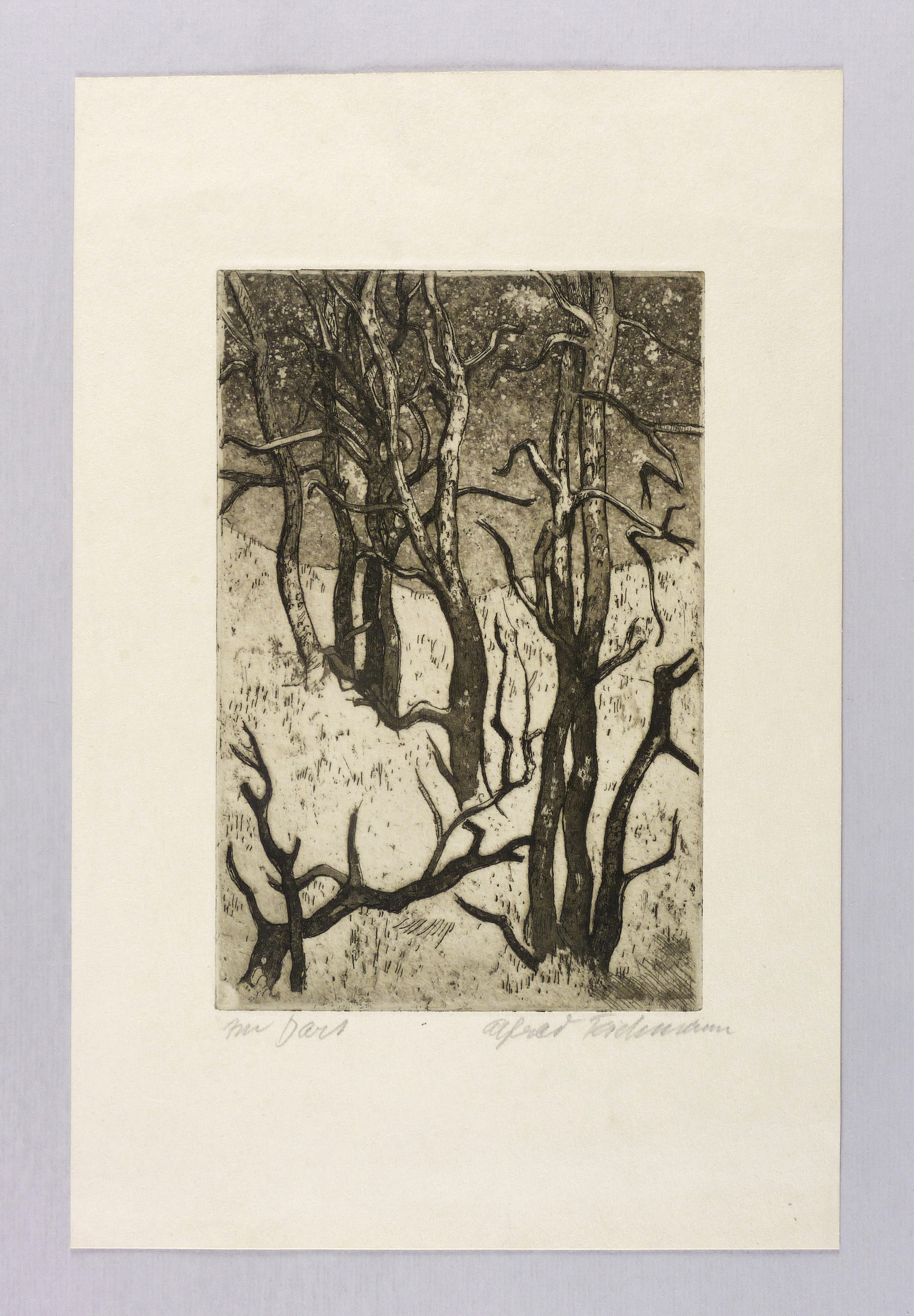 Rechts unten in Bleistift signiert: ″Alfred Teichmann″. Links Titel: ″Im Darß″. Verso weiter bezeichnet: ″Bäume im Winter″. – Sehr guter Zustand.
