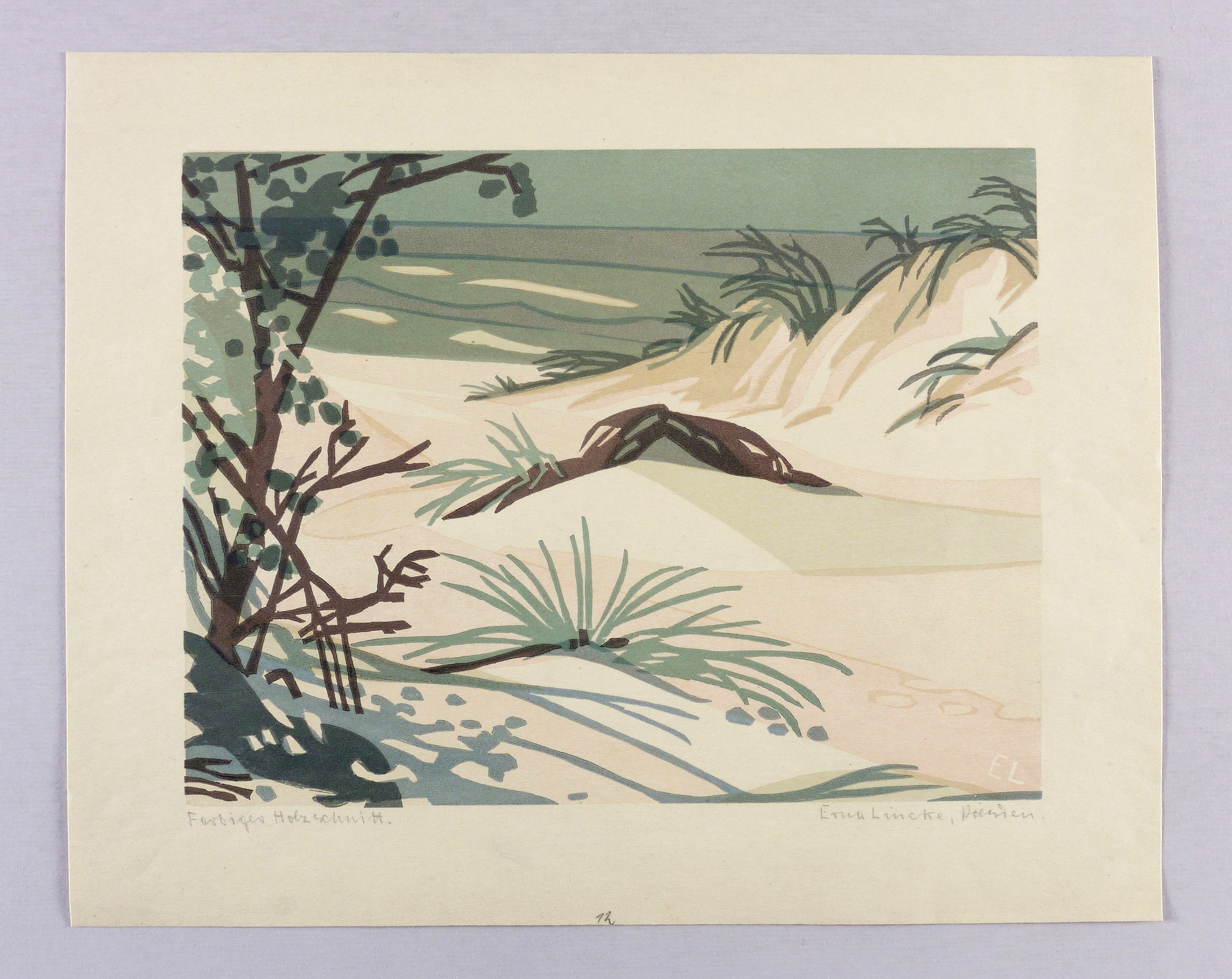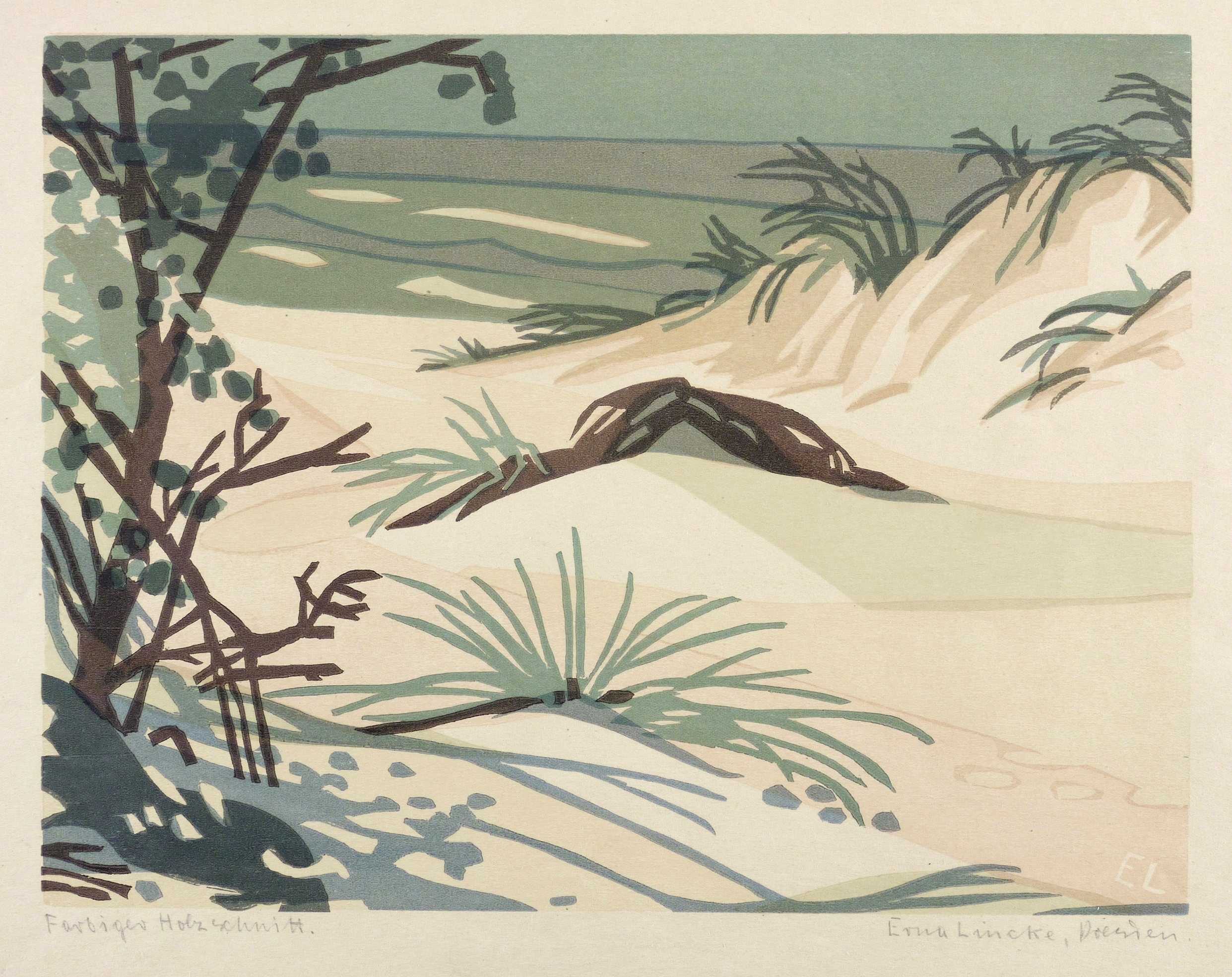 Rechts unten in Bleistift signiert: ″Erna Lincke, Dresden″. Links Technikbezeichnung: ″Farbiger Holzschnitt″. Im Druckstock rechts unten geschnittenes Monogramm: ″EL″. – Sehr guter Zustand.