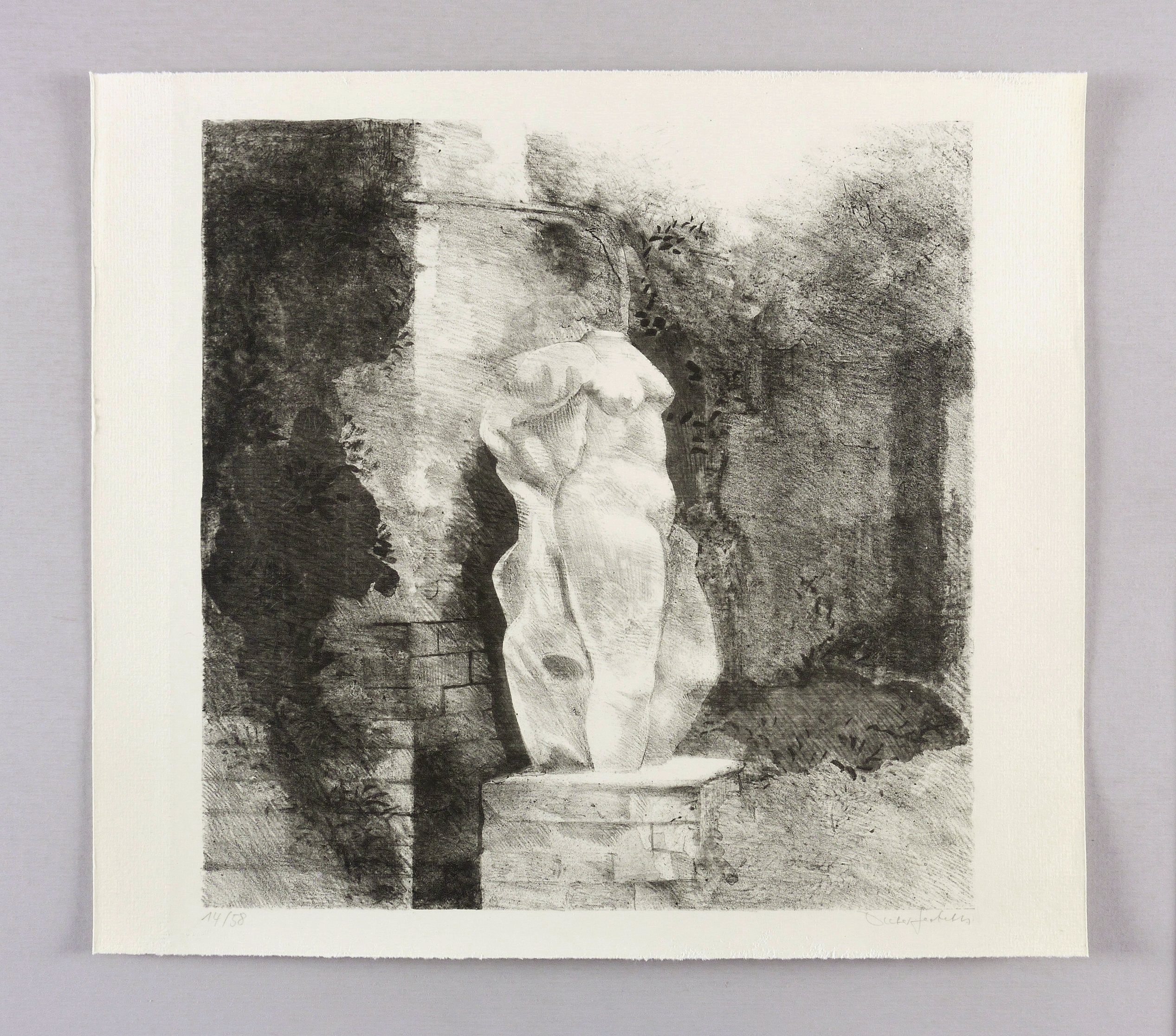 Um 1980. Lithografie / Kreide- & Pinsellithografie, in Schwarz, auf hartem hellchamois Maschinenbütten. – Originale Künstlergrafik, von Dieter Gerbeth. – Auflage Exemplar Nr. 14/58. – 29,9 x 29,4 cm (Darstellung / Druckbild), 34 x 38 cm (Blatt).