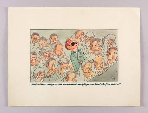 Links unten signiert: ″[K. Fho?]″. Unterhalb Inschrift: ″Haha! Der singt zum zweiunddreißigsten Mal, dass er tot is!″ – Sehr guter Zustand.