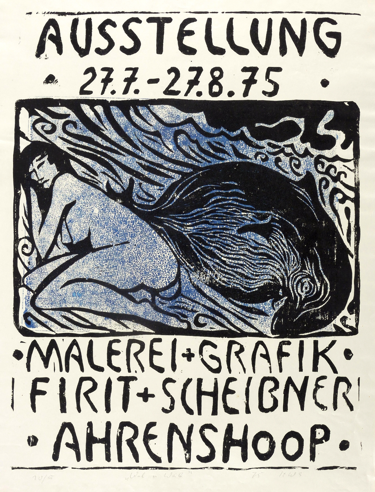 Rechts unten in Bleistift signiert und datiert: ″75 HWS″. Links Auflagenbezeichnung: ″10/5″. Mittig Titel: ″Wal u. Weib″. – Originalgrafisches Künstlerplakat zur Ausstellung ″Firit & Scheibner. Malerei & Grafik″ in Ahrenshoop 27.7.-27.8.1975. – Papier vor allem im Randbereich knickspurig . Guter Zustand.