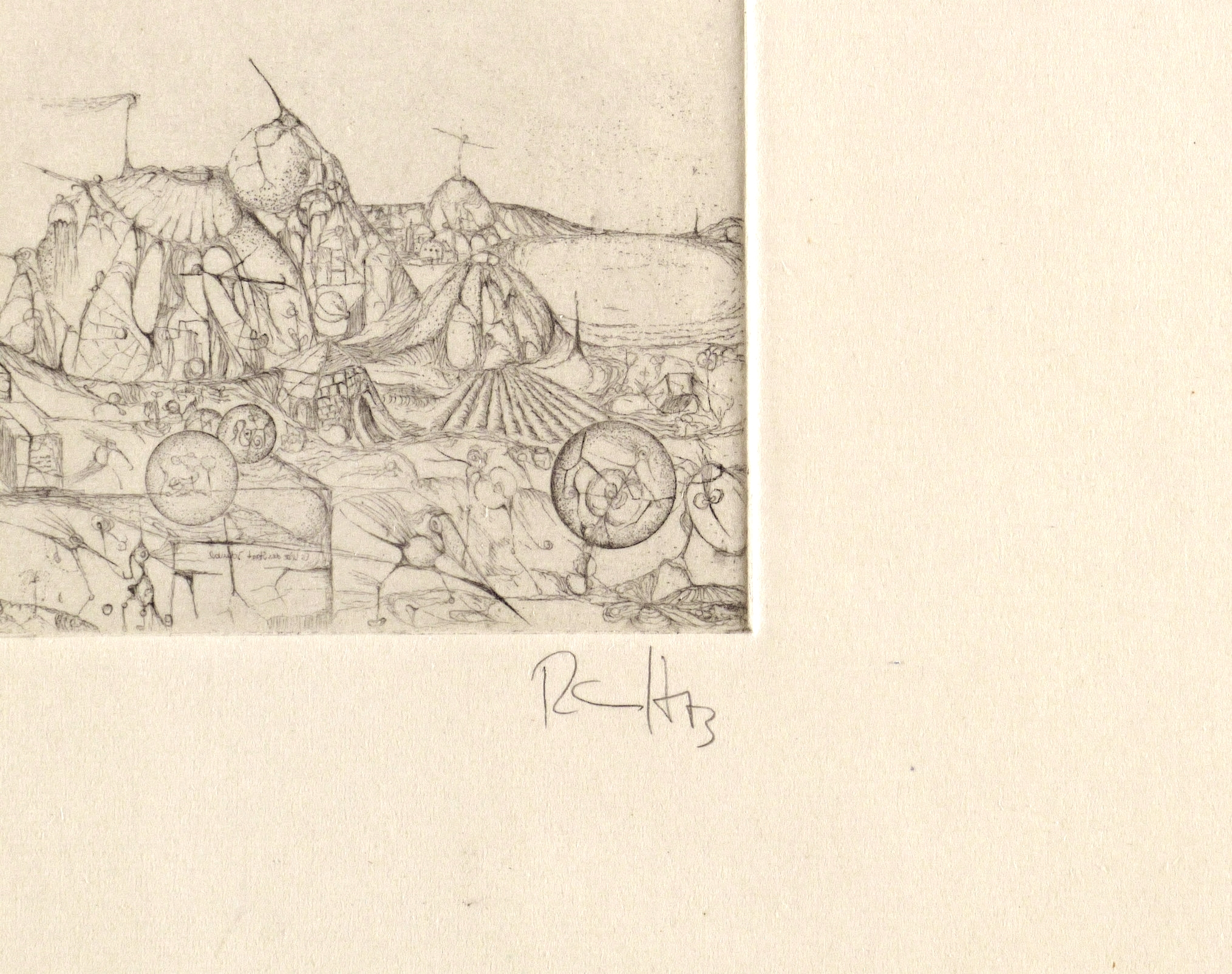 1973. Farbradierung / Strichätzung & Punzenstich, in Rotbraun & Schwarz, auf glattem hellchamois Velinkarton. – Originale Künstlergrafik, von Thomas Ranft. – Auflage Exemplar Nr. 20/30. – 15,4 x 22,0 cm (Darstellung / Platte), 21 x 27 cm (Blatt).