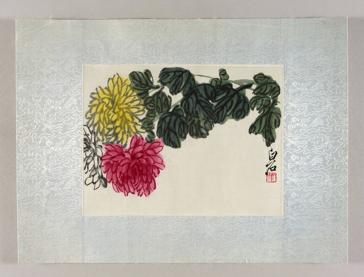 Rechts unten Signaturstempel in Rot. Dazu in Schwarz chinesische Schriftzeichen. – Edition des Verlags Rong Baozhai in Peking 1953. – Blatt knapp um die Darstellung beschnitten und auf mit hellblauer Seide bezogenem Karton gesetzt. Insgesamt guter Zustand.
