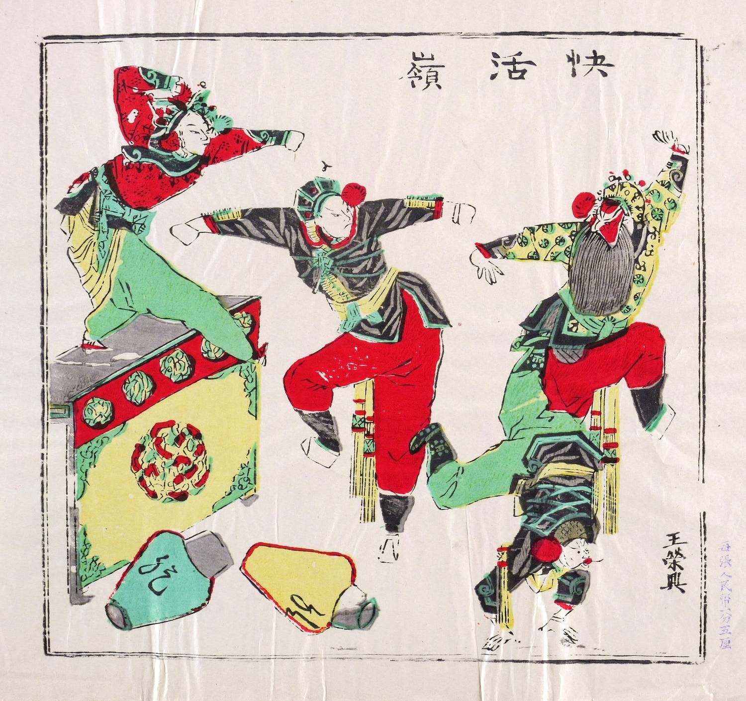Diverse chinesische Schriftzeichen. Rechts unten in Schwarzblau Verlagsstempel. – Neujahrsblatt. Taohuayu-Druck aus Suzhou, dem Zentrum des chinesischen Holzdrucks der Qing Dynastie. – Papier mit leichten Lagerspuren. Insgesamt guter Zustand.