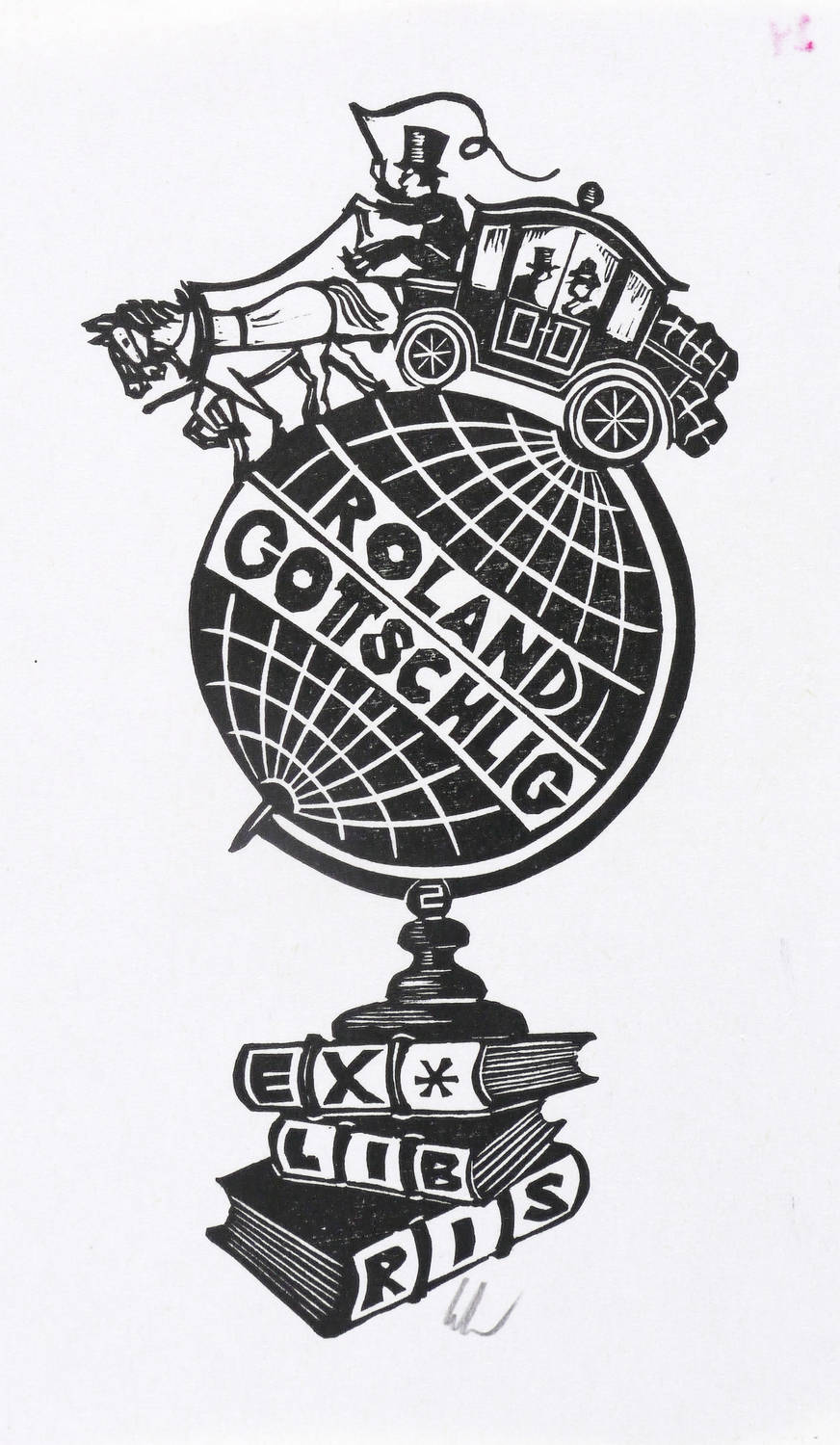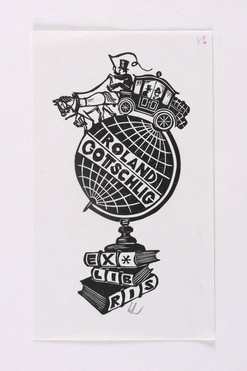 Unterhalb in Bleistift signiert: ″Schmid″. Im Druckstock geschnittene Inschrift: ″ROLAND GOTTSCHLIG EXLIBRIS″. – Ohne Mängel. Sehr guter Zustand.