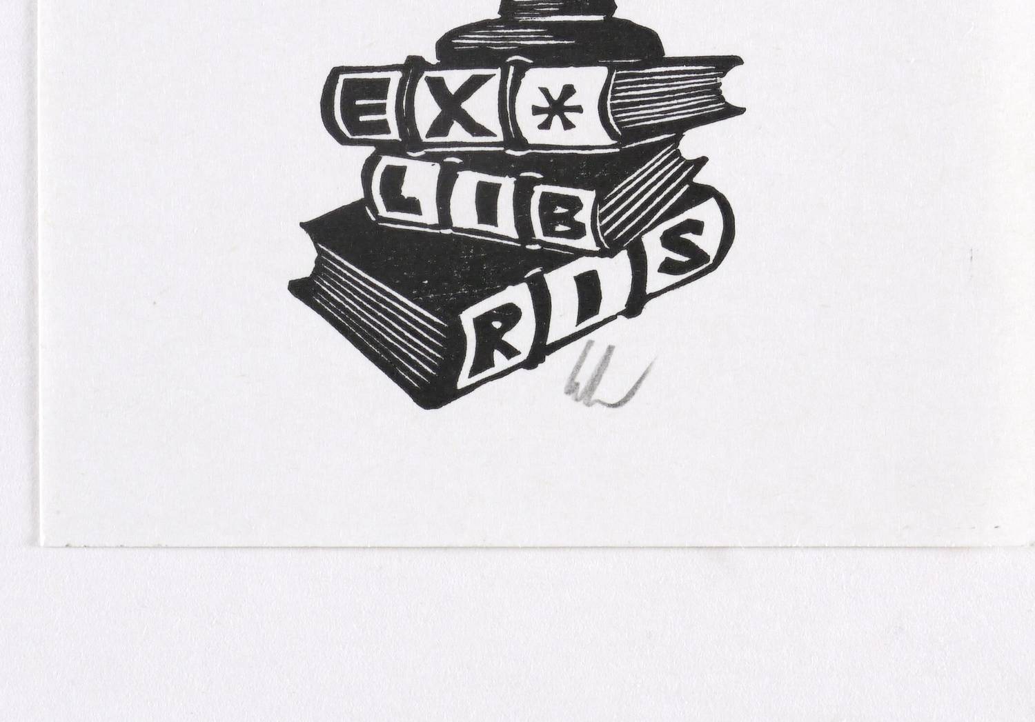 1970-1980. Holzschnitt, in Schwarz, auf glattem hellchamois Bütten. – Exlibris, von Hubert Schmid. – 11,8 x 6,3 cm (Darstellung / mit Schrift), 14 x 9 cm (Blatt).