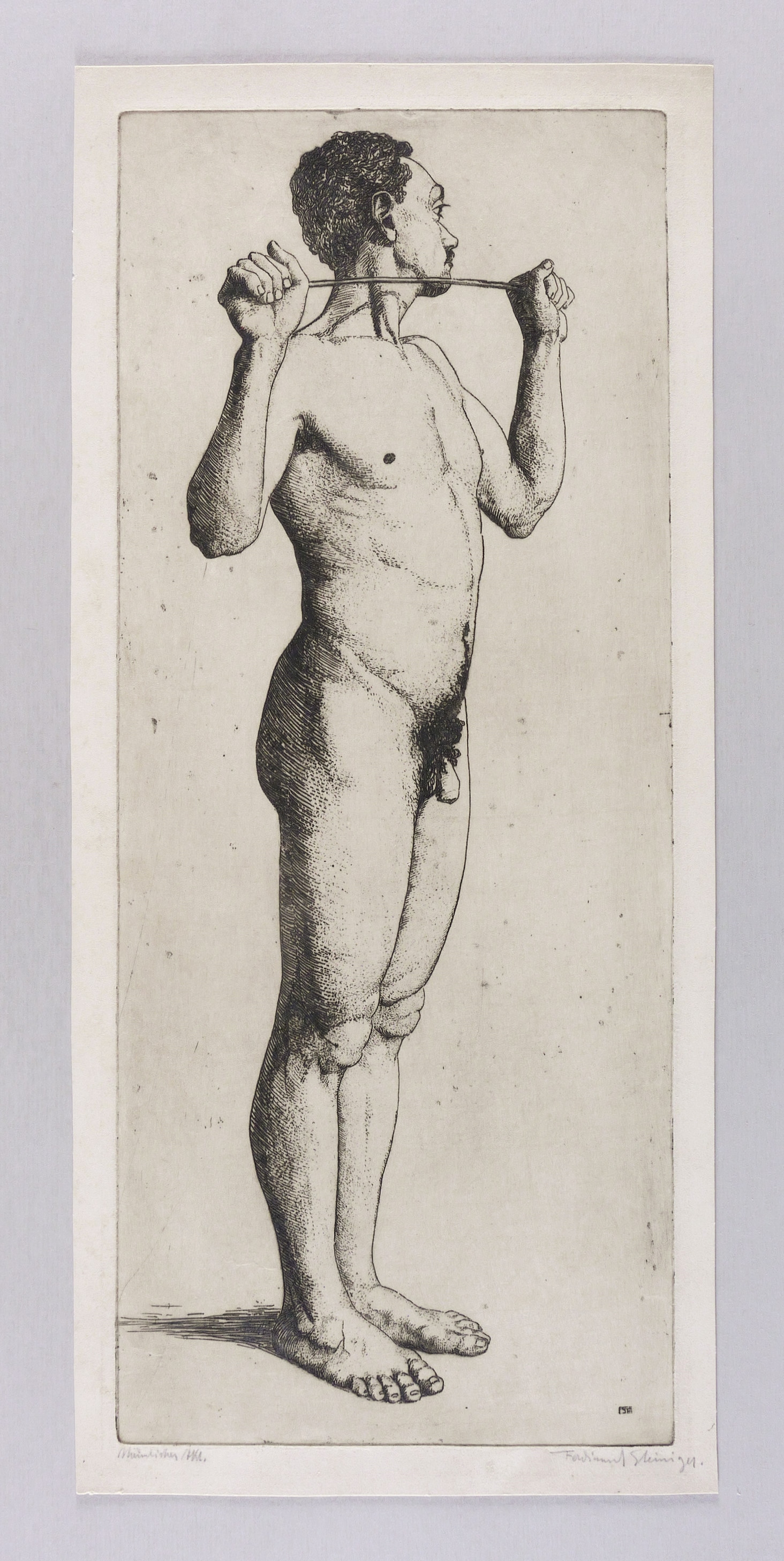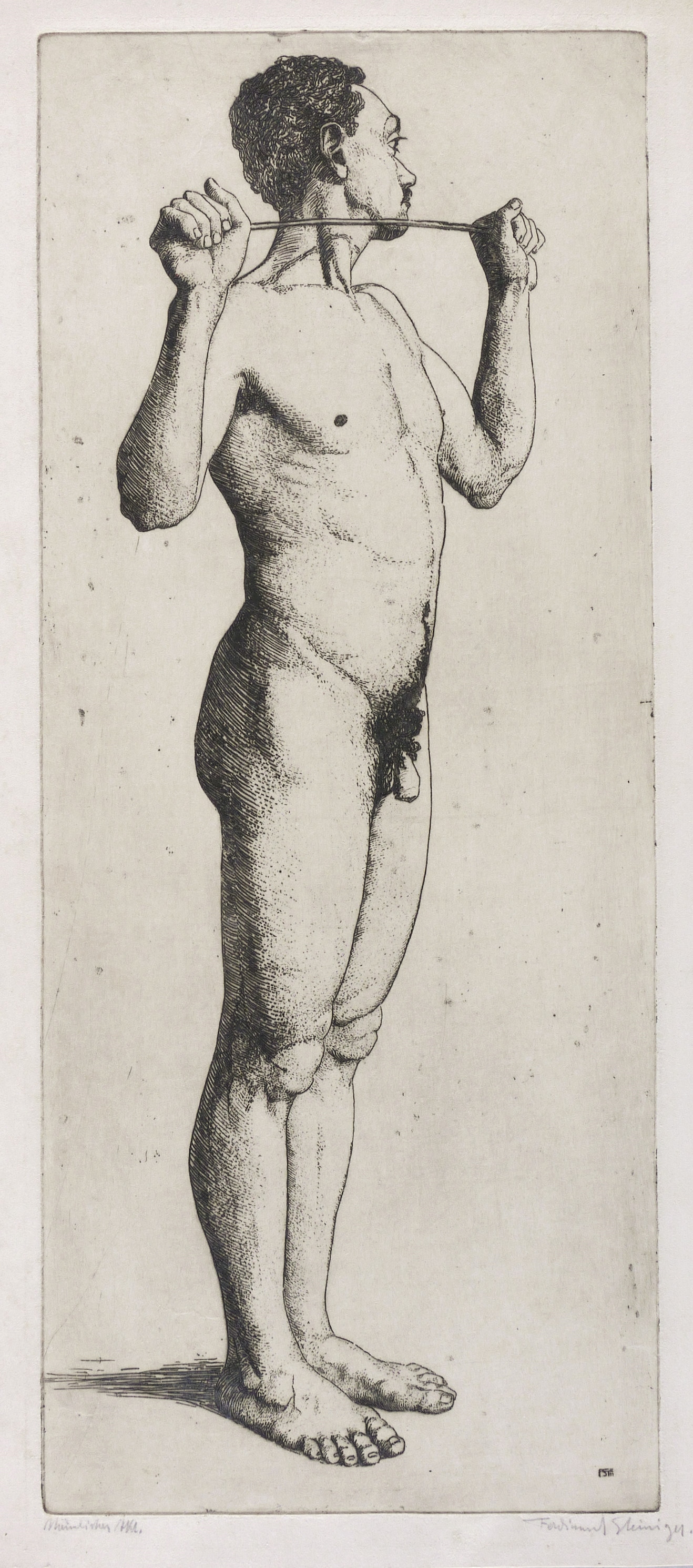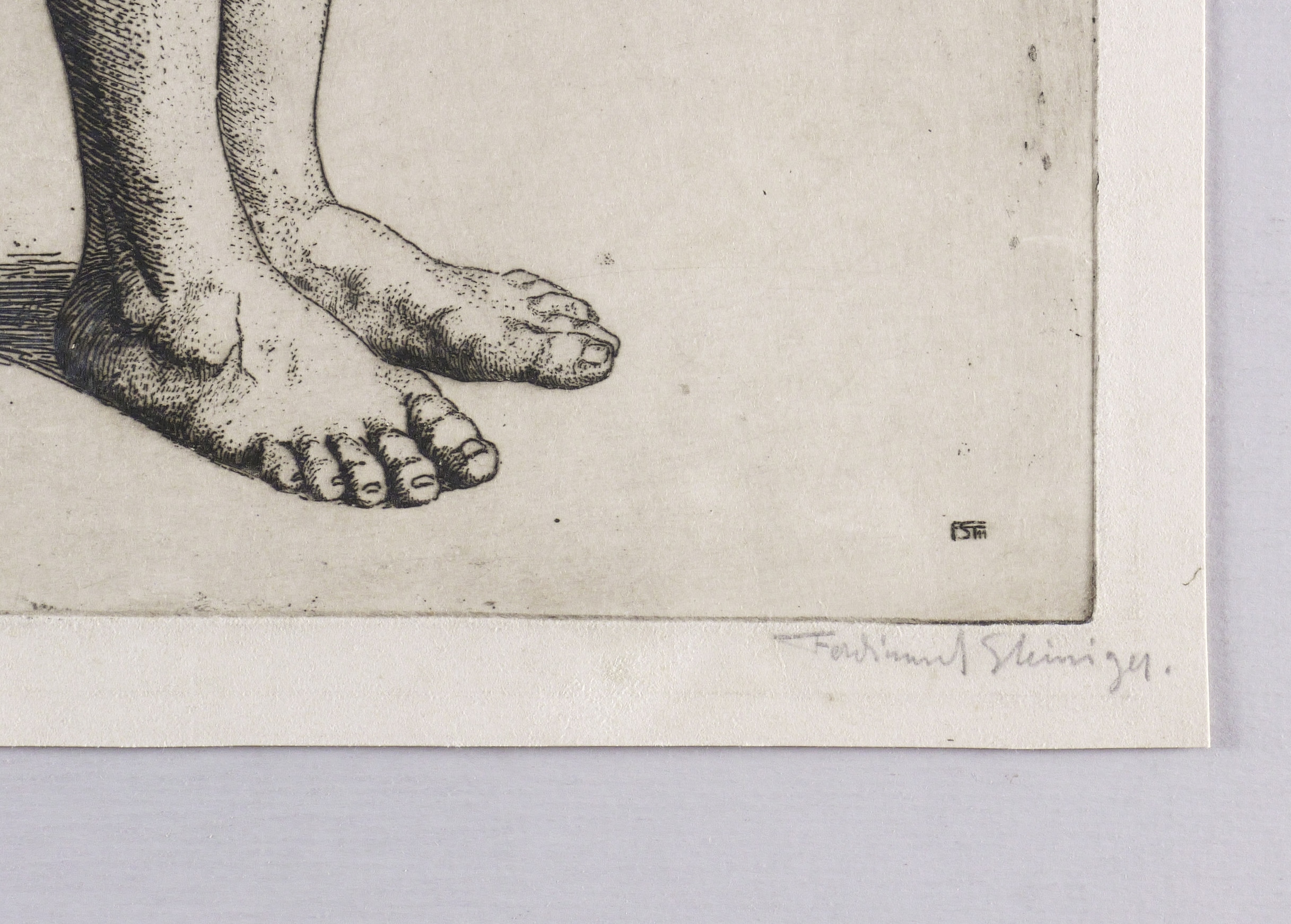 Rechts unten in Bleistift signiert: ″Ferdinand Steiniger″. Links betitelt: ″Männlicher Akt″. In der Platte rechts unten Monogramm und Jahr: ″FST 11″. – Schmalrandiges Exemplar. Papier gering fleckig. Mäßig guter Zustand.