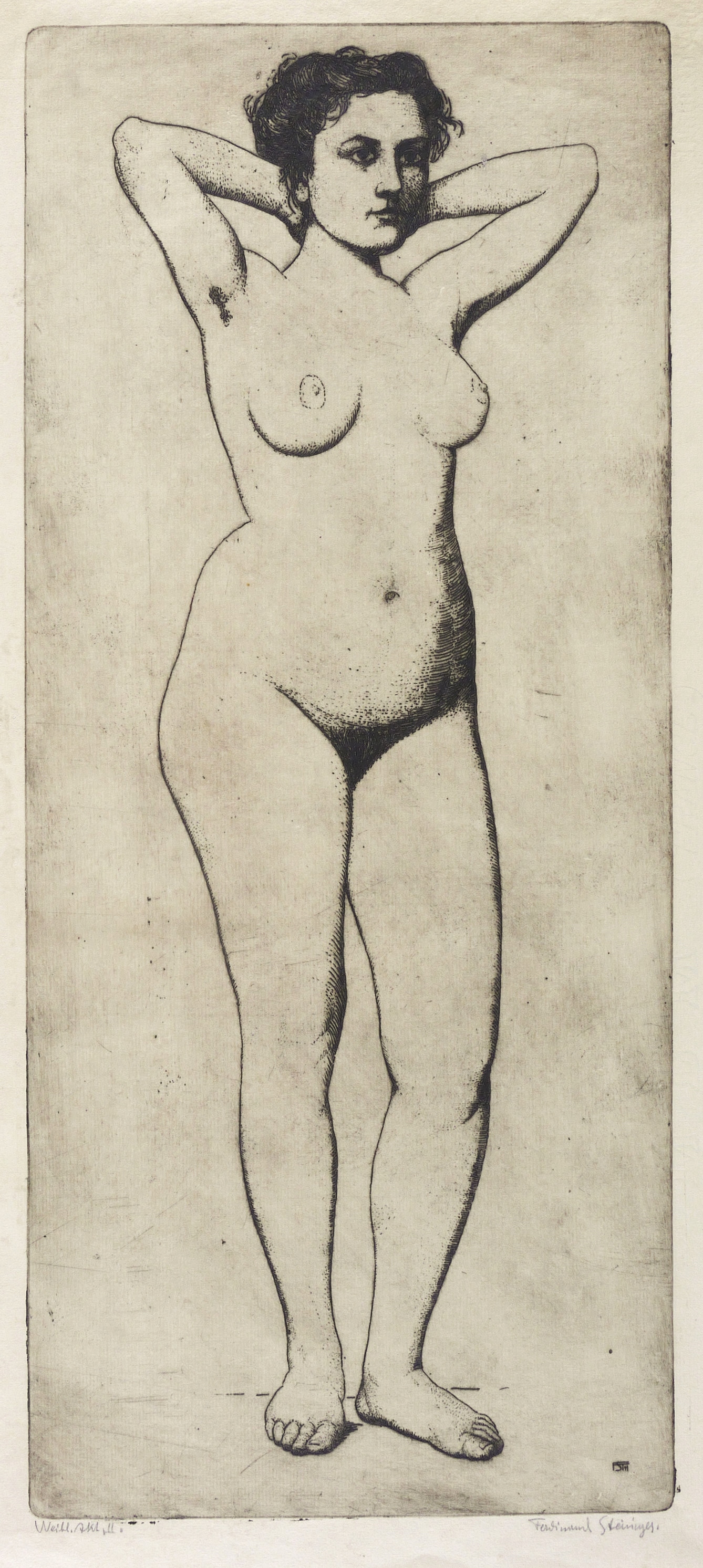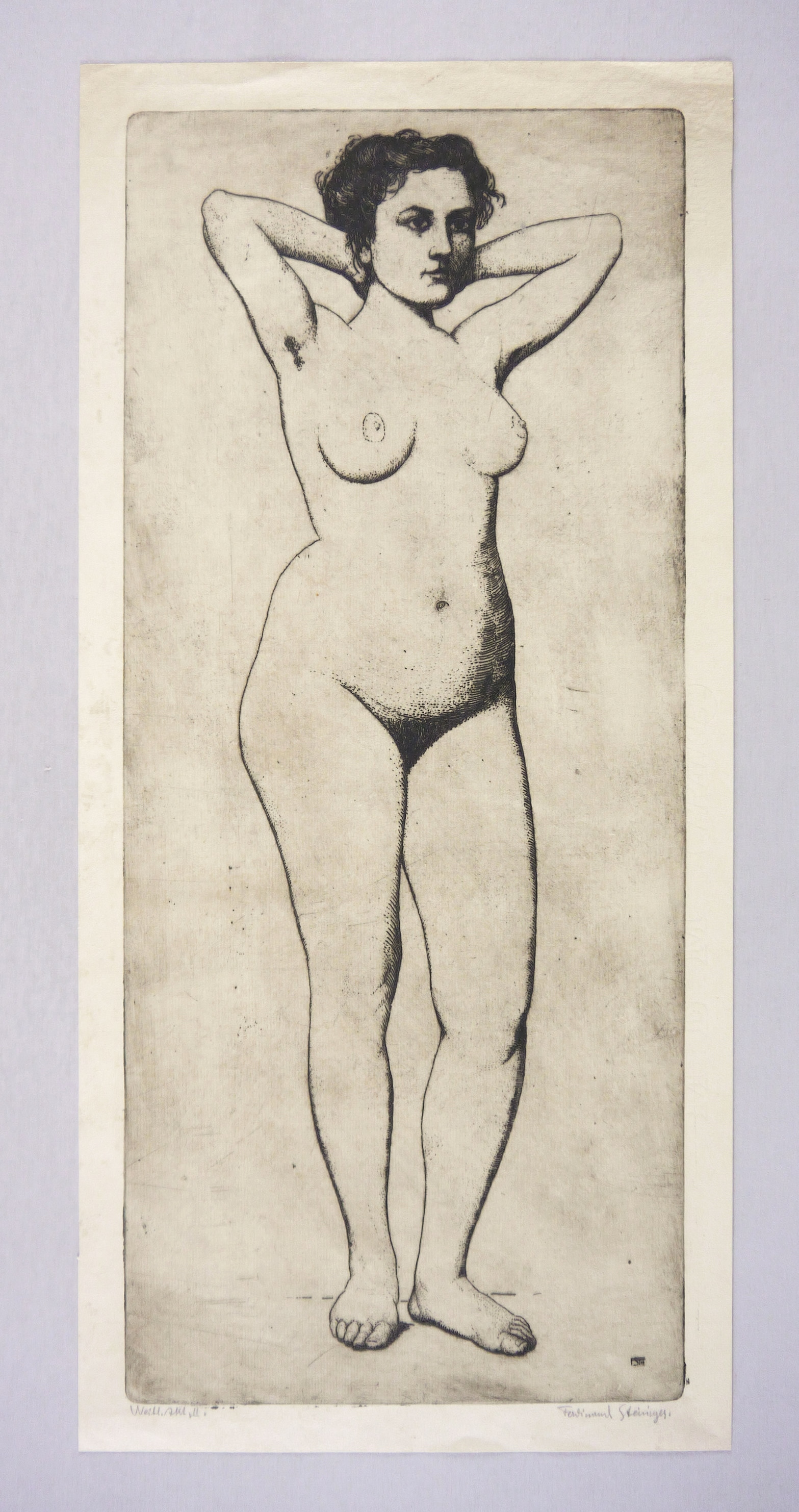 Rechts unten in Bleistift signiert: ″Ferdinand Steiniger″. Links betitelt: ″Weibl. Akt″. In der Platte rechts unten Monogramm und Jahr: ″FST 11″. Wasserzeichen von Ingres Arches. – Schmalrandiges Exemplar. Papier gering fleckig. Mäßig guter Zustand.
