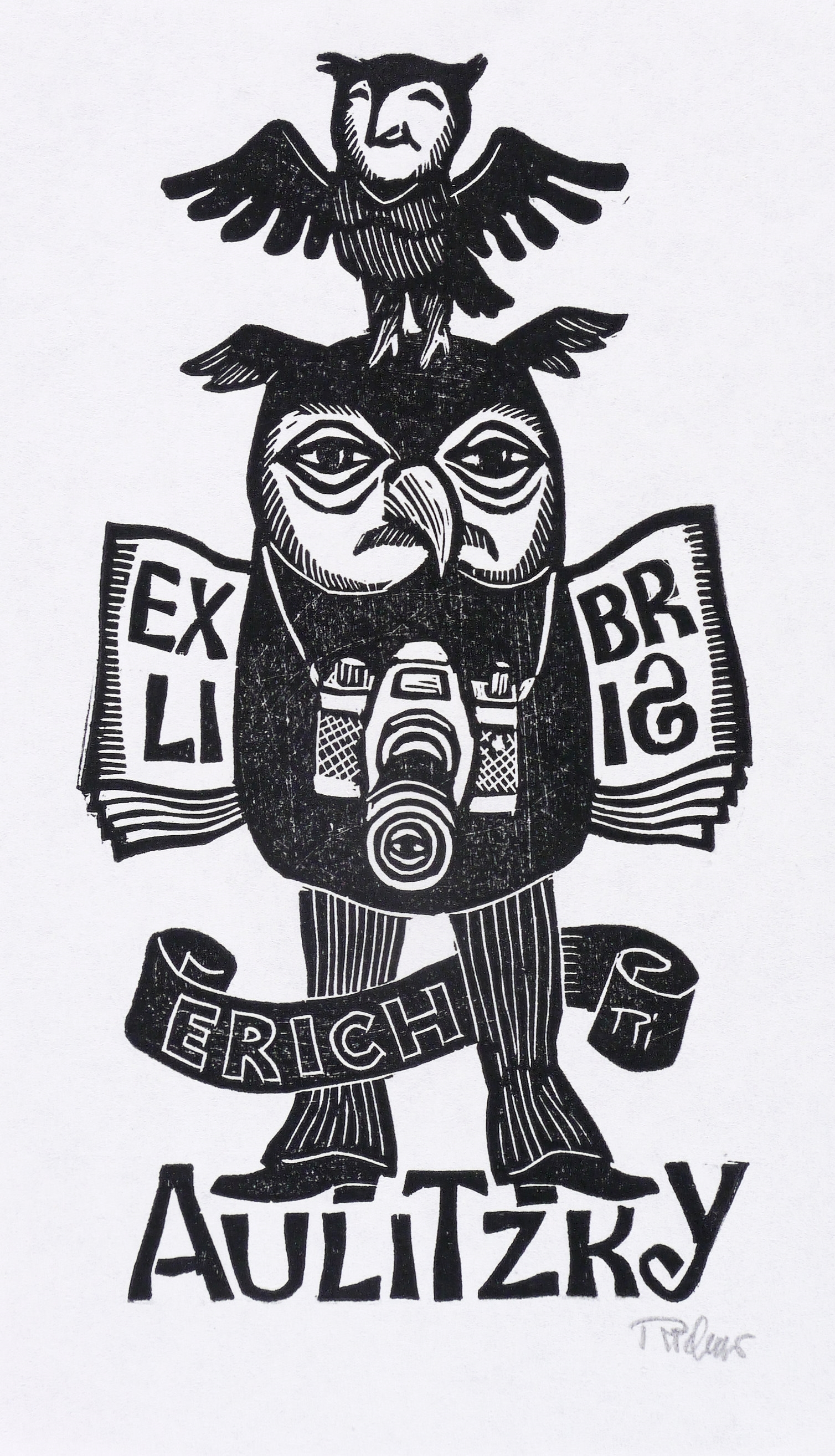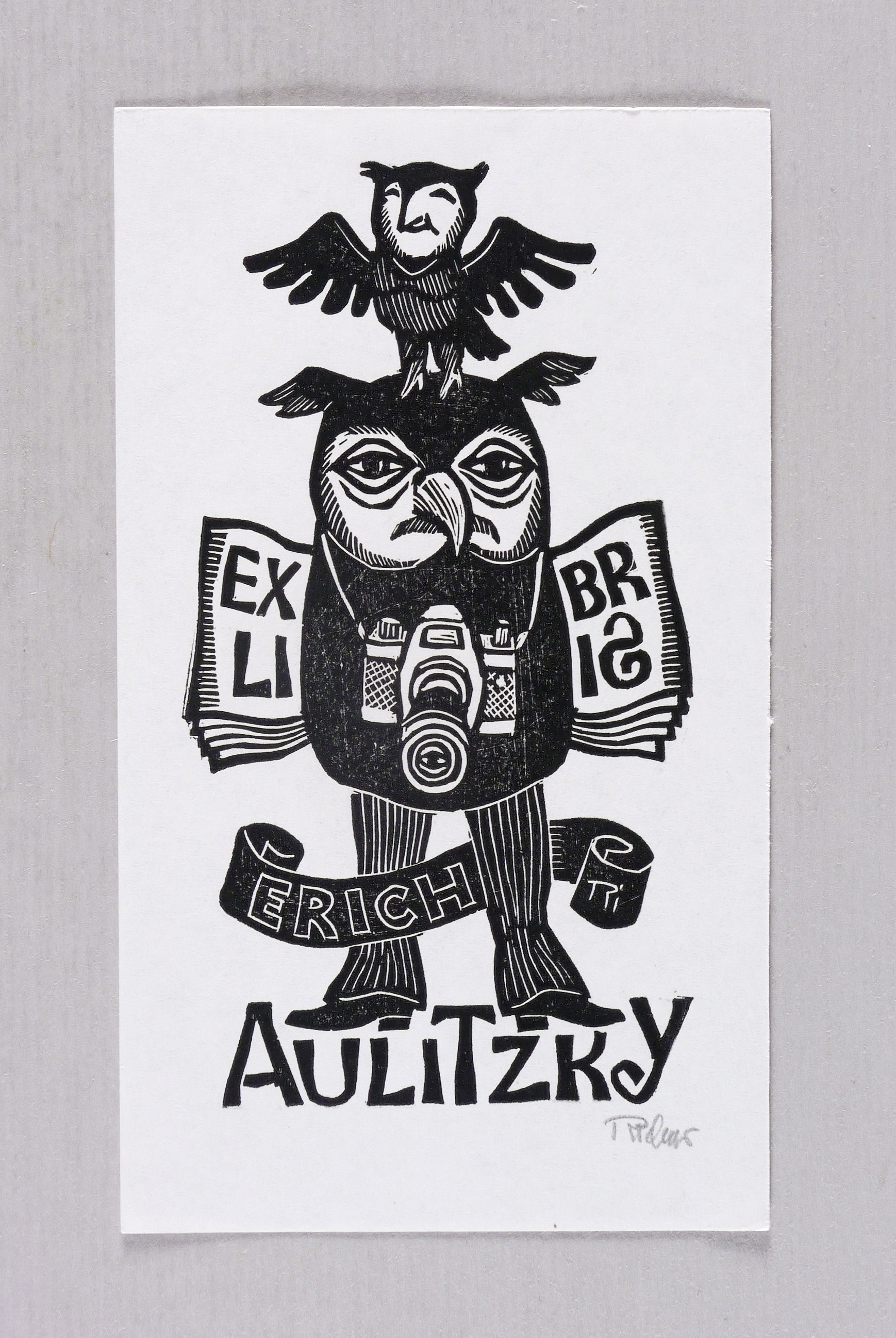 Richter, Willi. – „Exlibris Erich Aulitzky (Eule mit Fotoapparat)”.